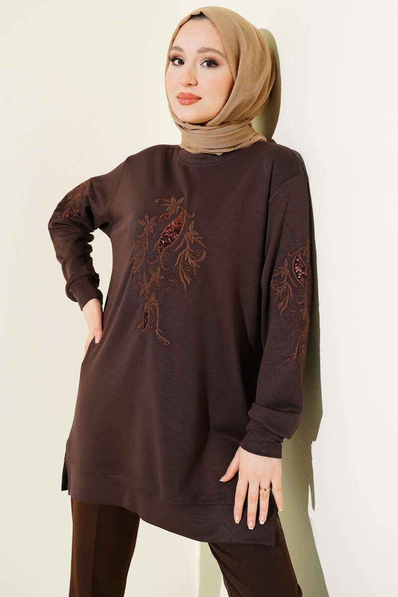 Yaka ve Kol Nakışlı Pullu Loyşa Tunik Bordo