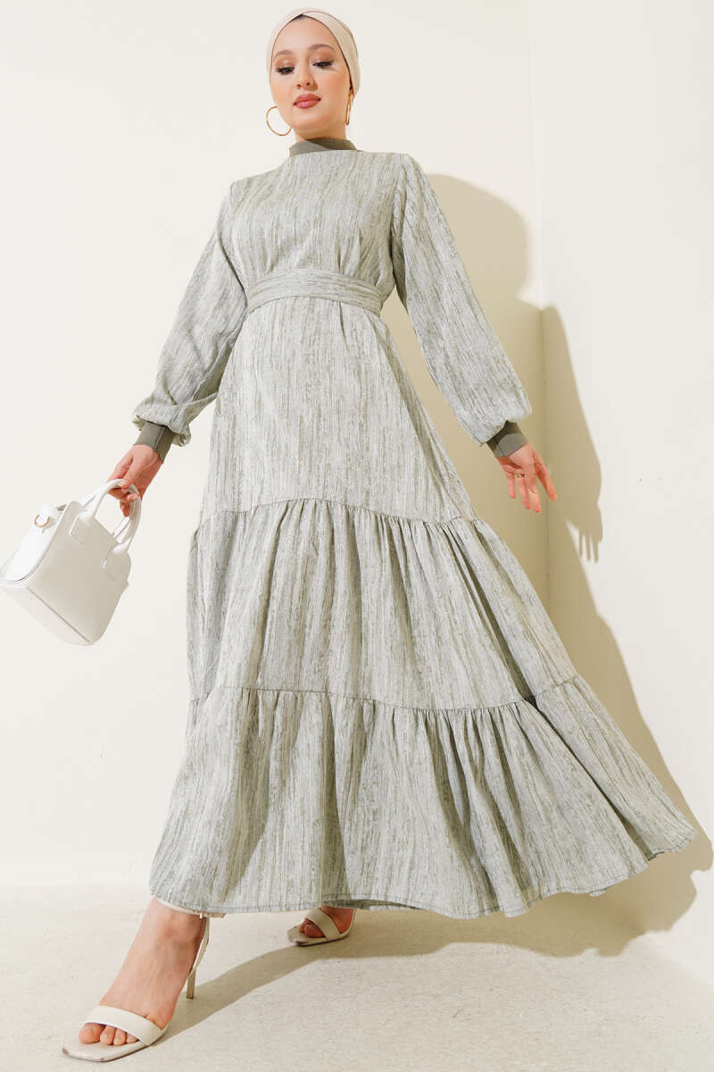 Yakası Yarım Fermuarlı Triko Elbise Yağ Yeşili