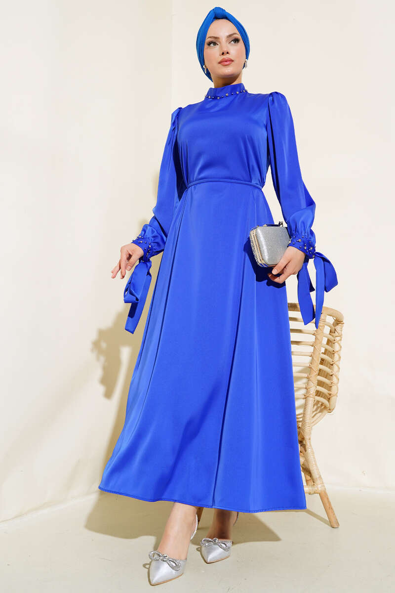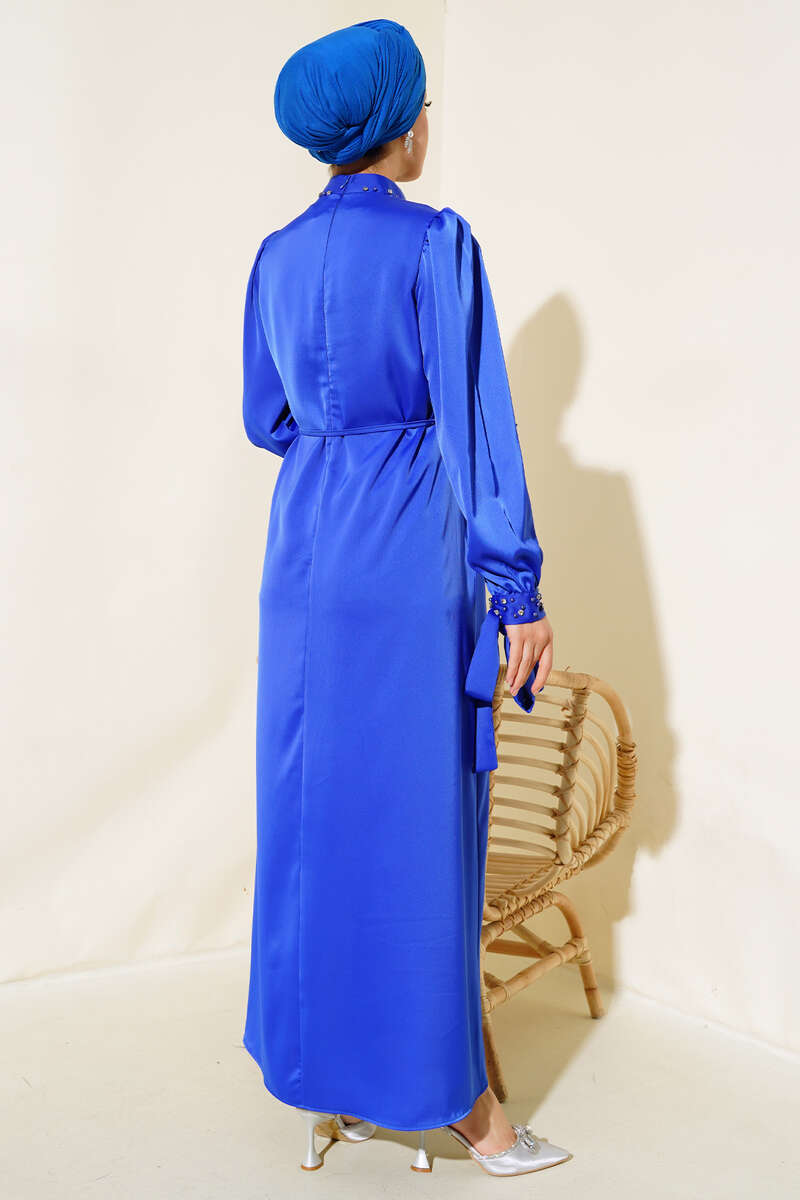 Yeni sezon saten elbisemiz şık tasarımıyla sizlerle beraber. Elbisemizin yakası ve kol bilekleri taşlarla süsleniştir. Sırtı fermuarlıdır. Elbisemizin kendi kumaşından ip bağcığı vardır. Astarsızdır. Kol bilekleri bağlamalıdır. Şık ve zarif elbisemiz özel günleriniz parçası olacaktır.