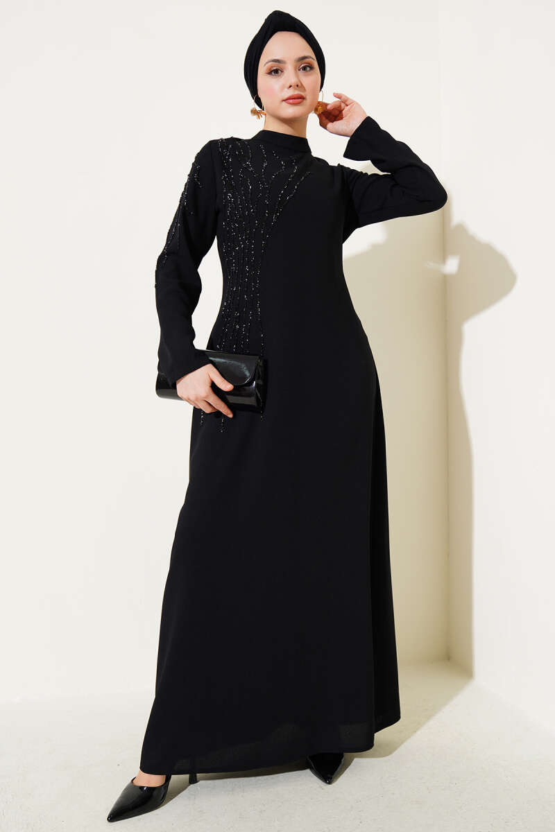 Düğmeli Tensel İnce Kemerli Elbise Siyah