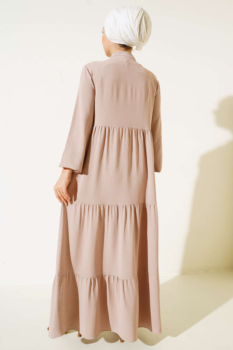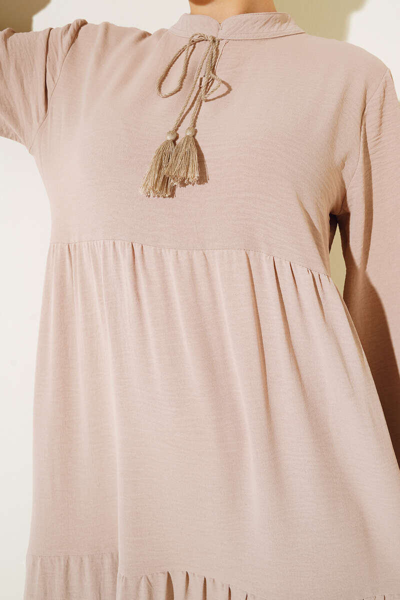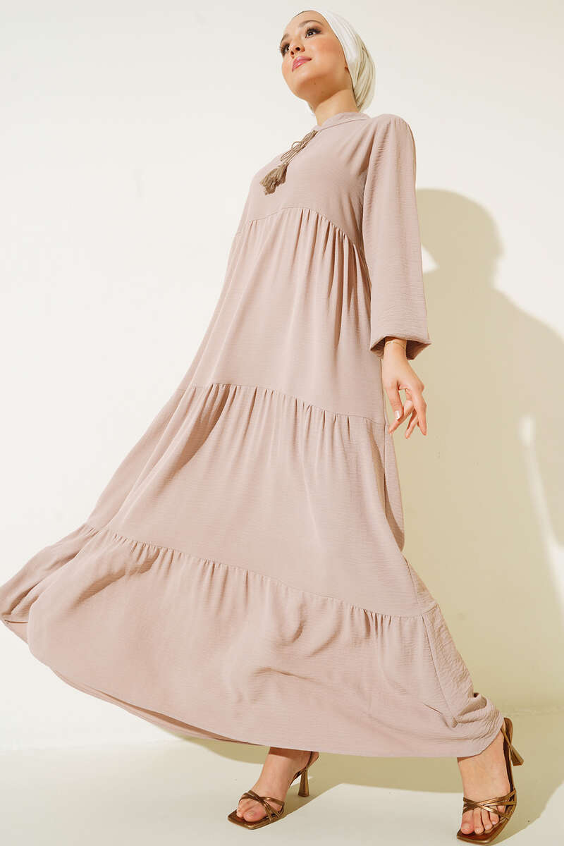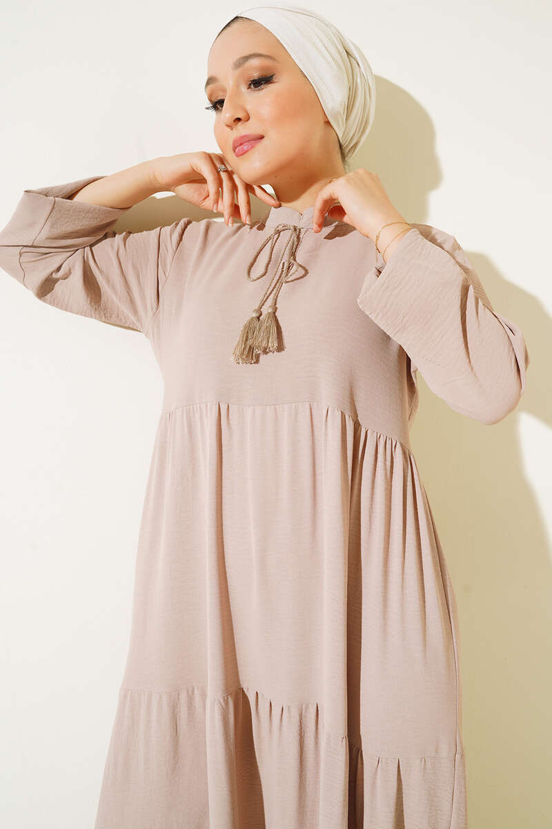 Yeni sezon model elbisemiz dikkat çeken tasarımıyla sizler için geldi. Elbisemiz kat kat modeldir. Yakasından sarkan ipi vardır ve uçları püsküllüdür. Bilekleri lastiklidir. Oldukça rahattır. Her ortamda rahatlıkla giyebilirsiniz. Renk çeşitleri mevcuttur.