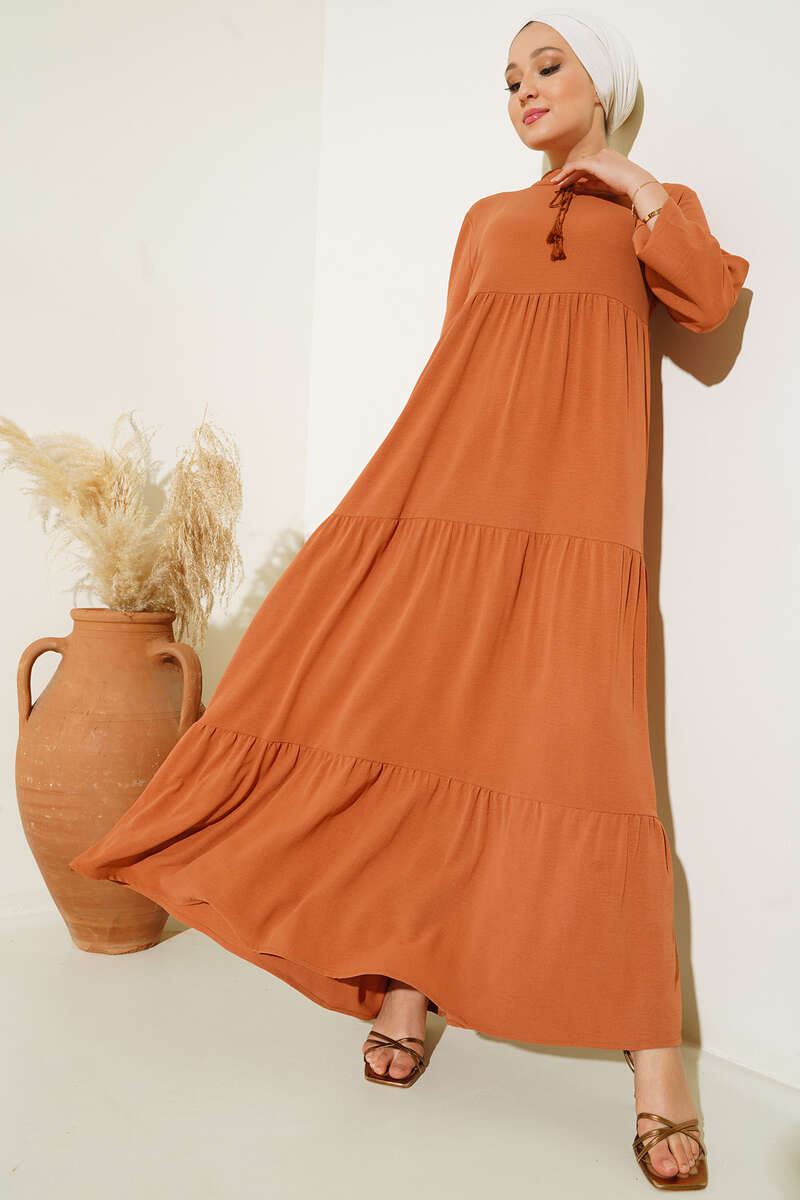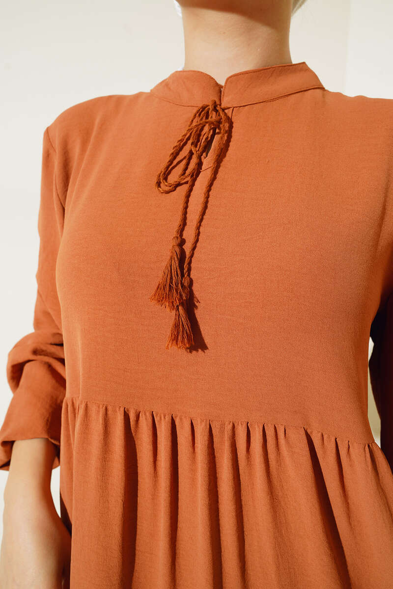 Yeni sezon model elbisemiz dikkat çeken tasarımıyla sizler için geldi. Elbisemiz kat kat modeldir. Yakasından sarkan ipi vardır ve uçları püsküllüdür. Bilekleri lastiklidir. Oldukça rahattır. Her ortamda rahatlıkla giyebilirsiniz. Renk çeşitleri mevcuttur.