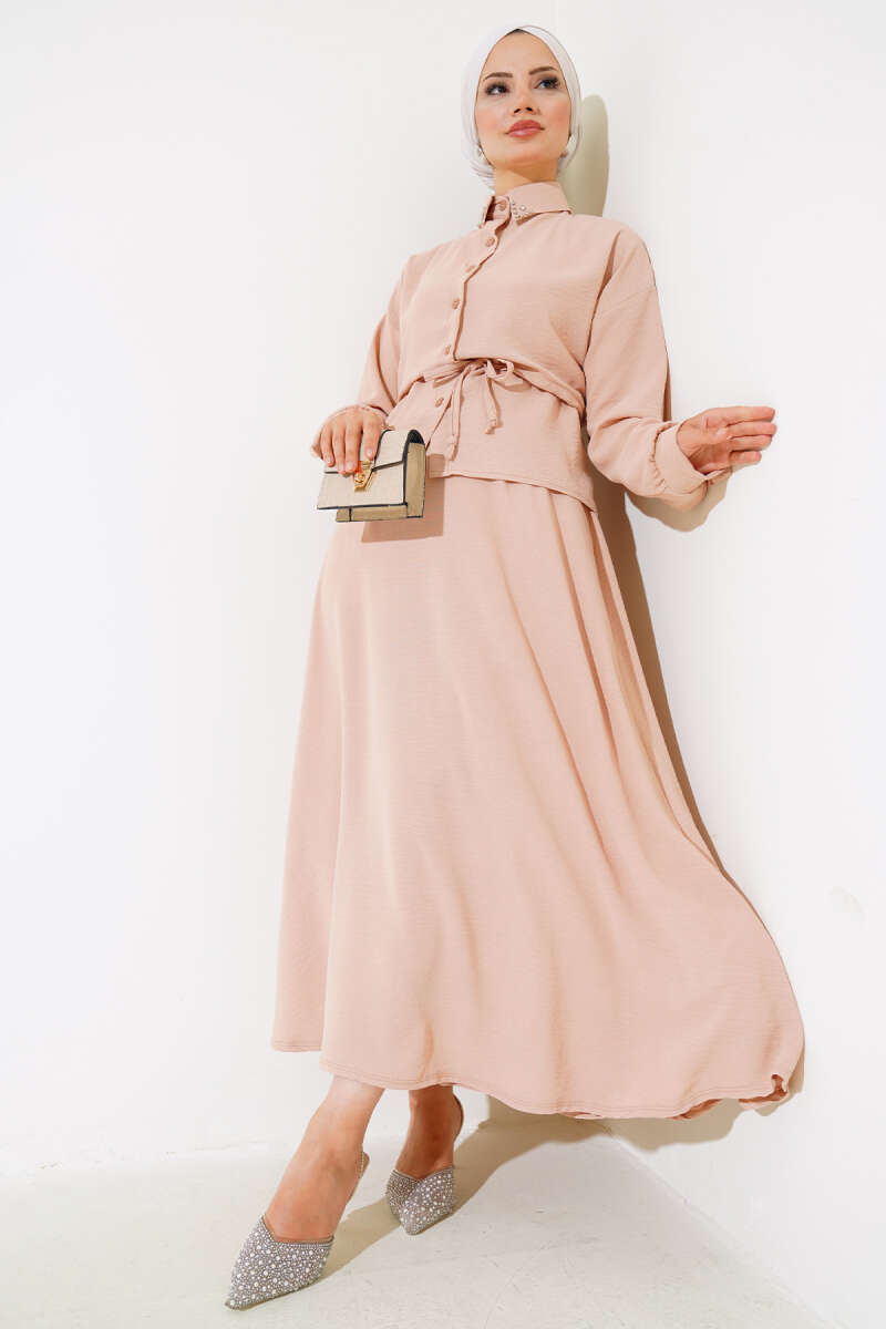 Önü Mini Düğmeli Elbise İkili Takım Füme