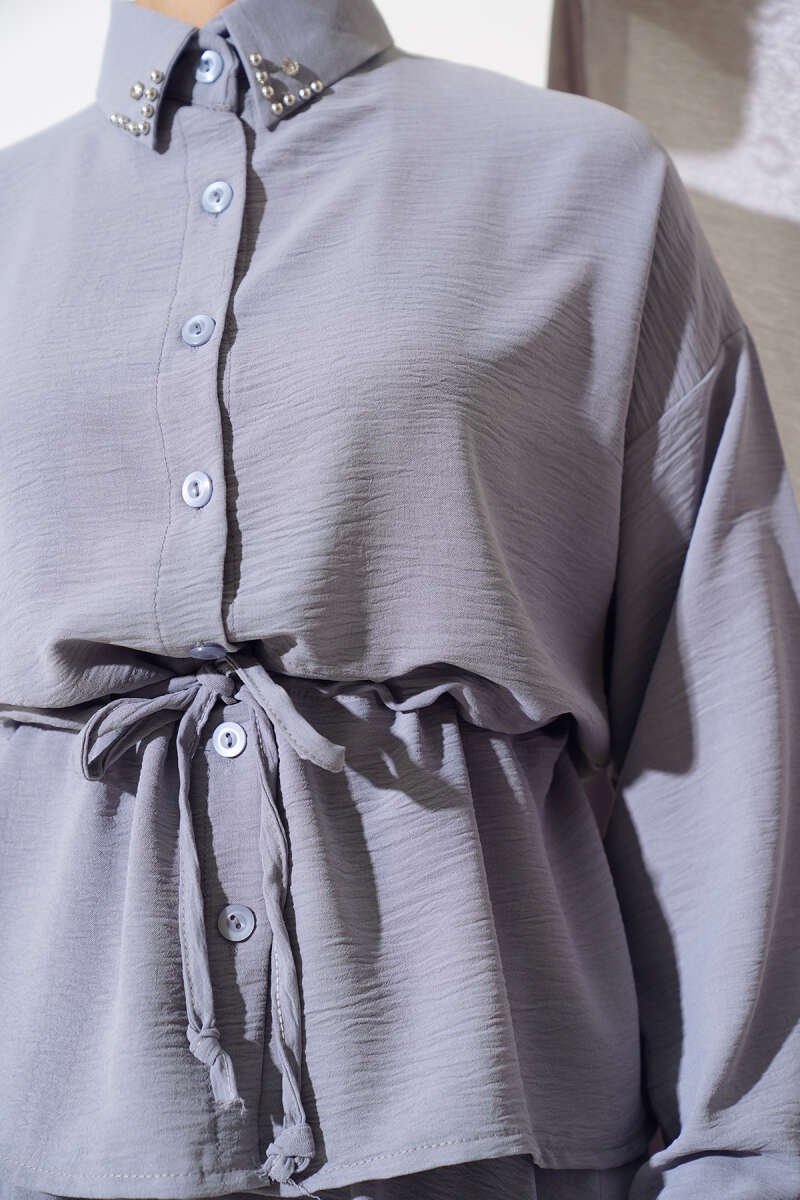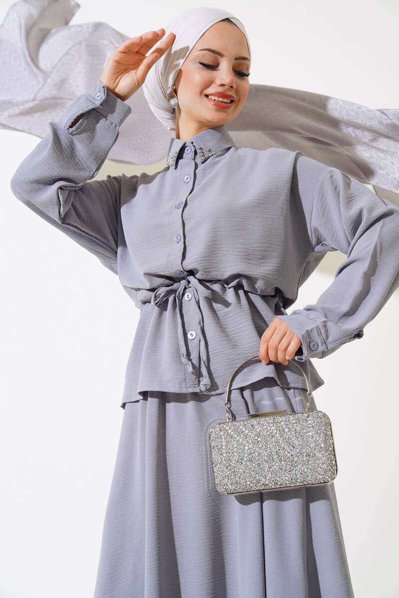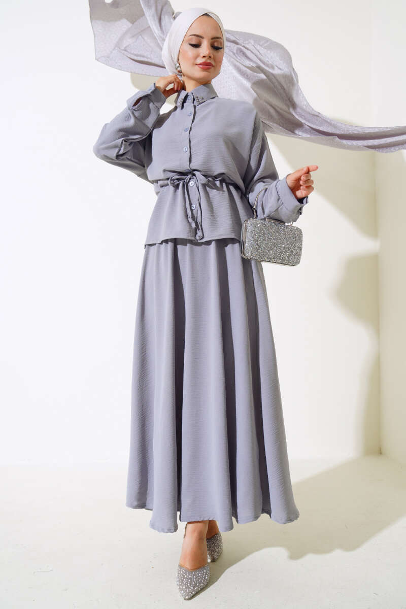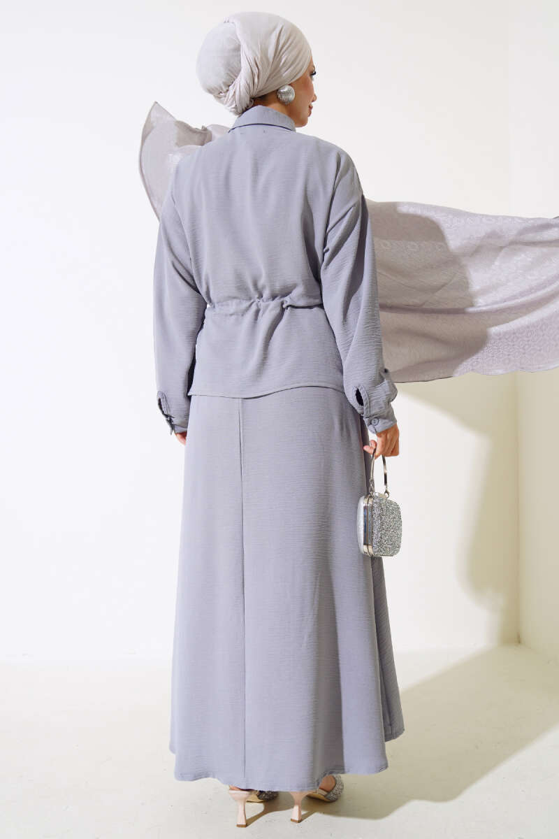 Önü Mini Düğmeli Elbise İkili Takım Füme