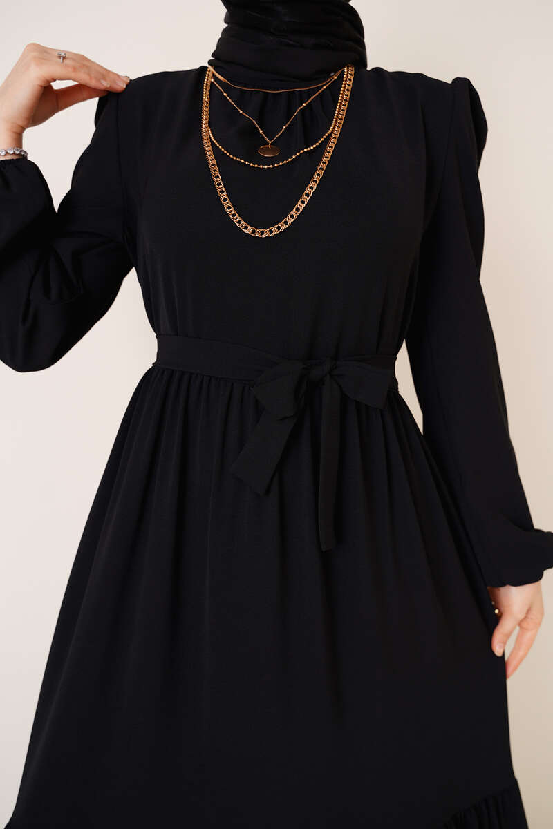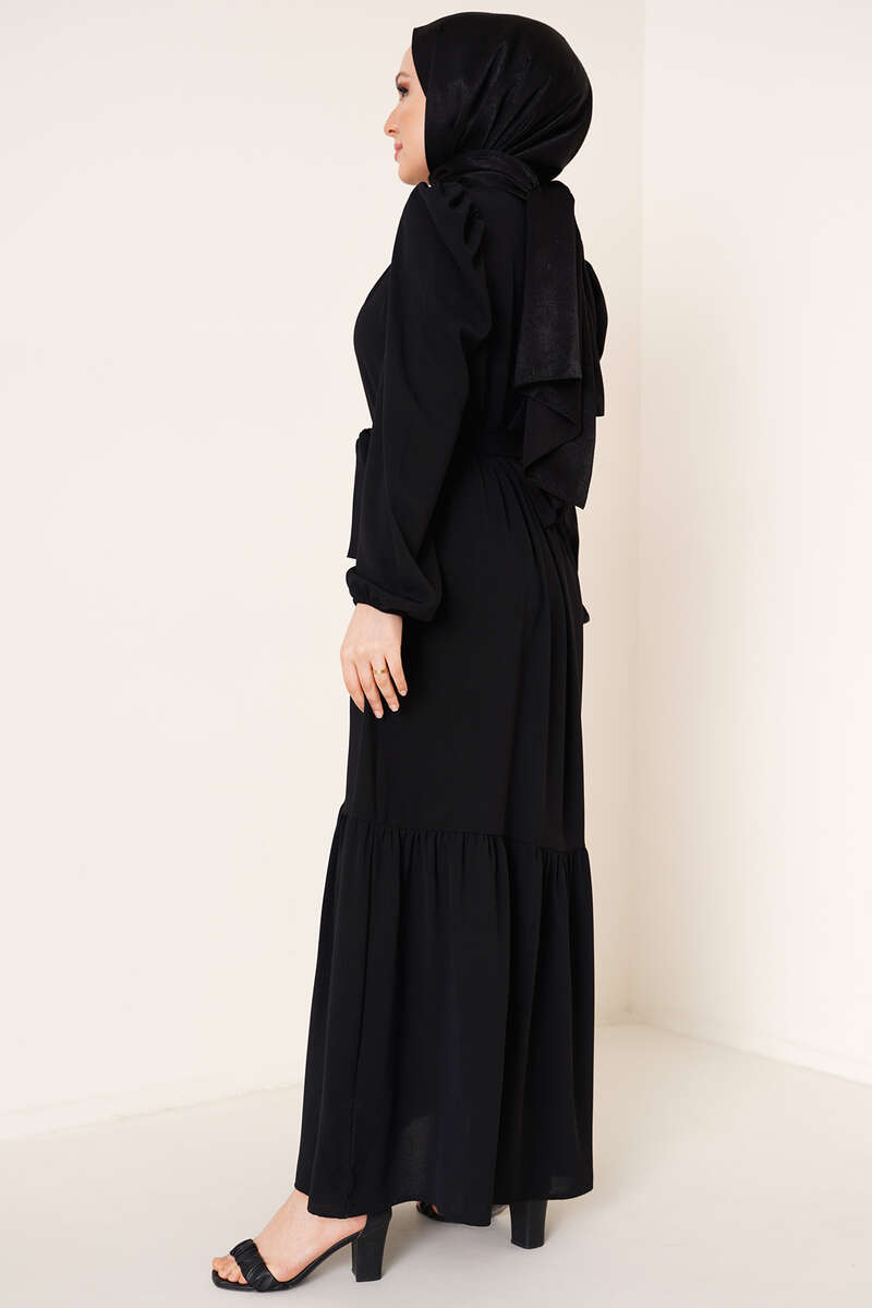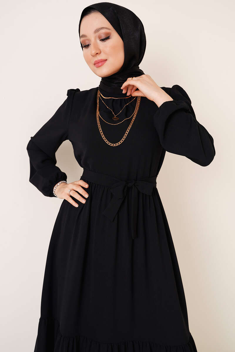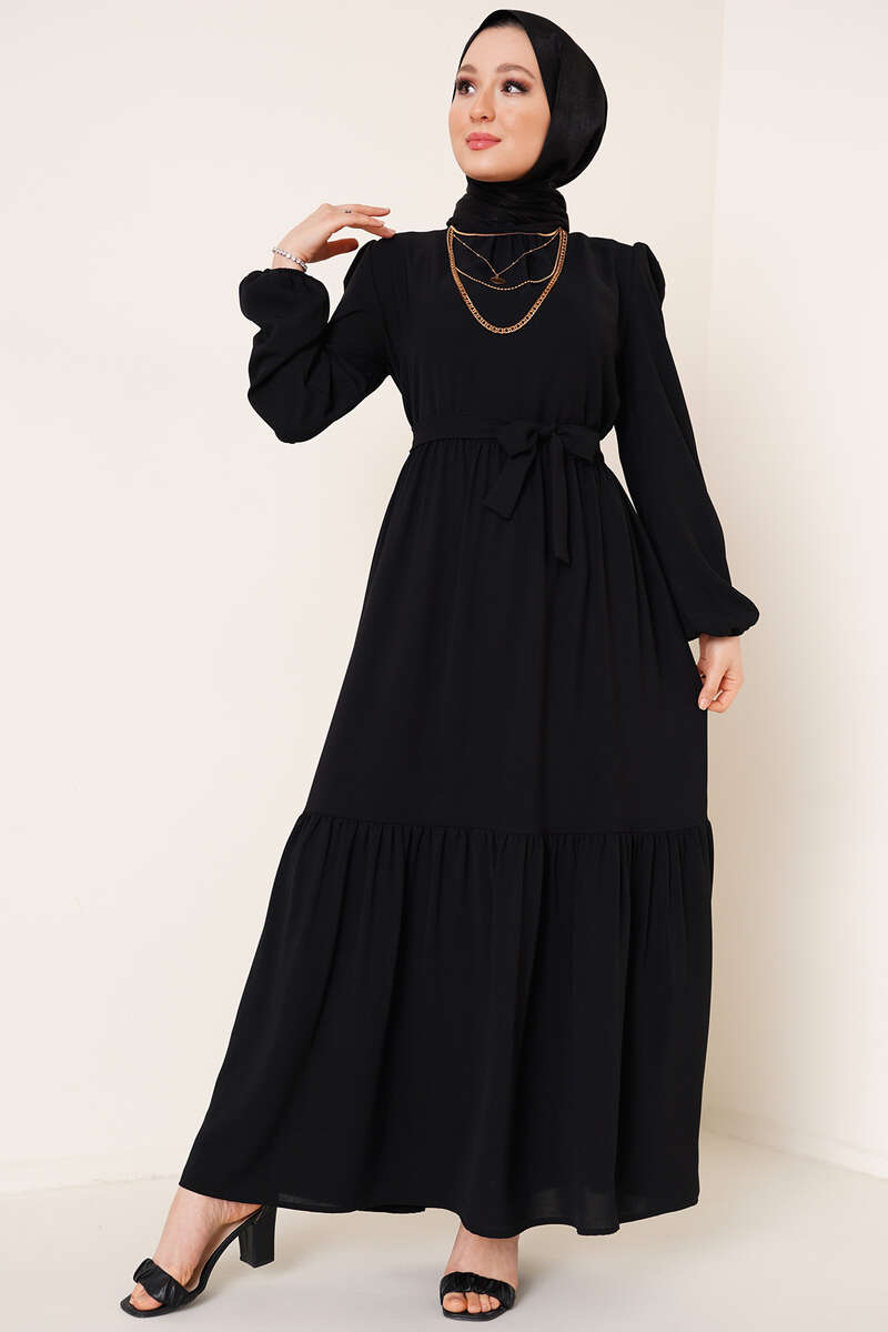 Yeni sezon ayrobin elbise kat kat modeldir. Yakasında bulunan büzgü detayı elbisemize hareket kazandırmıştır. Beli kuşaklı olan elbisemizin ense düğmesi bulunmaktadır. Omuzlarında da büzgü detayı bulunan elbisemizin bilekleri lastiklidir.