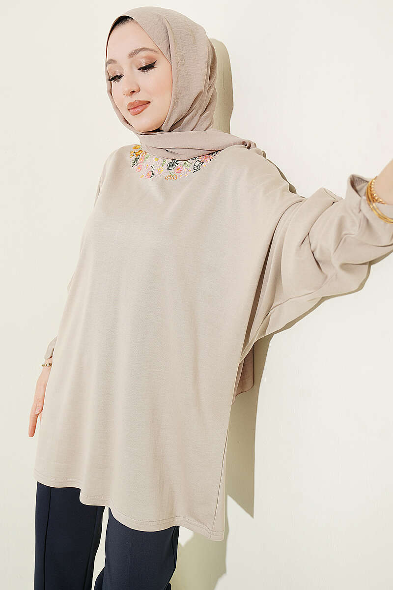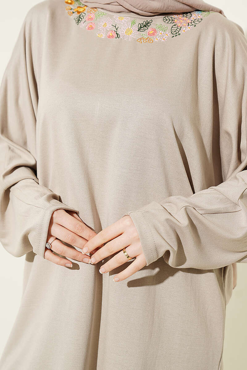 Yakası Çiçek Nakışlı Loyşa Tunik Bej