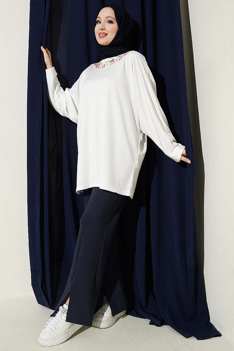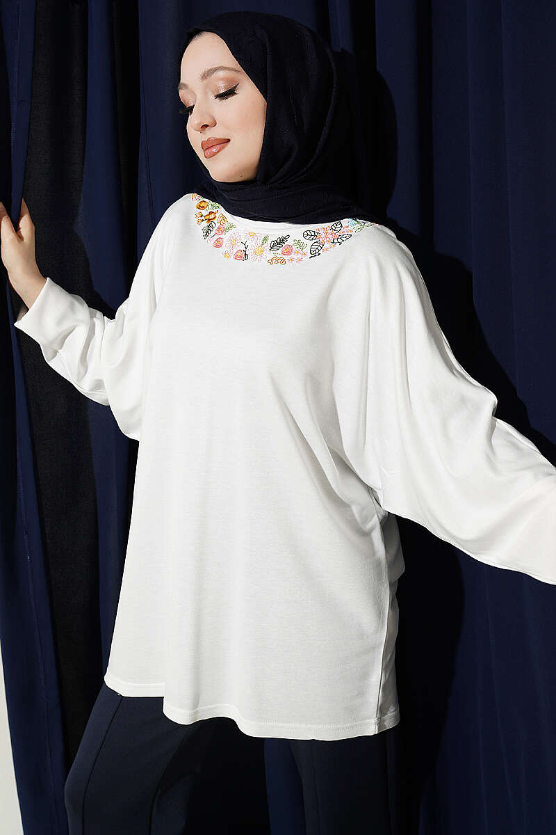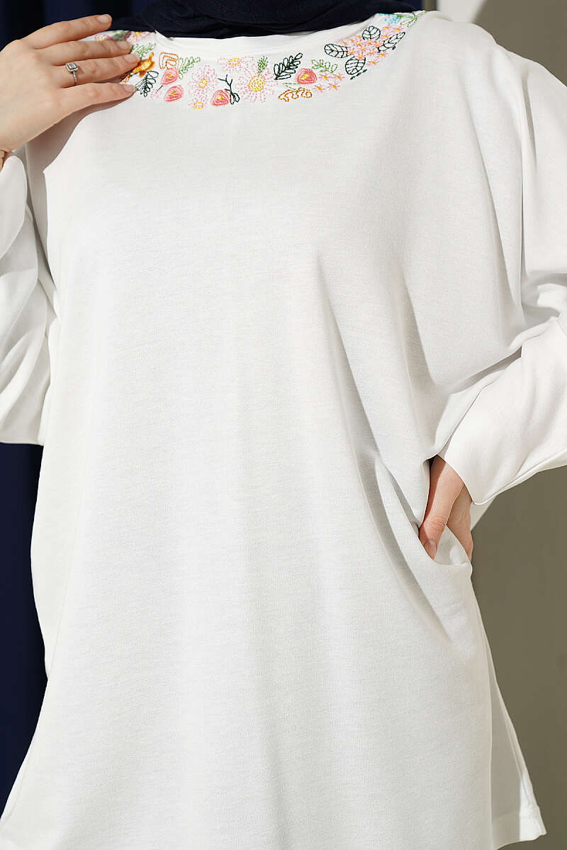 Yakası Çiçek Nakışlı Loyşa Tunik Beyaz
