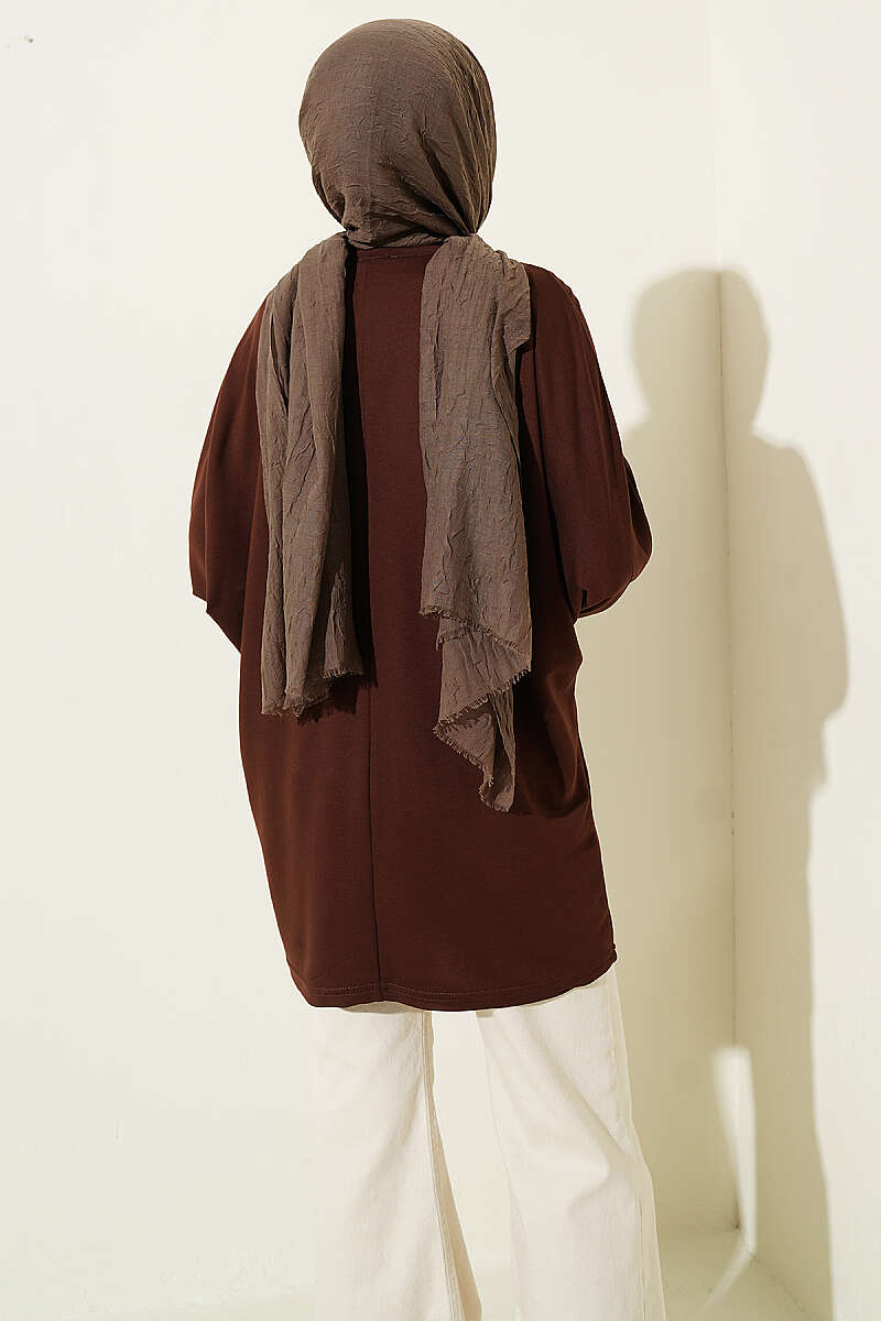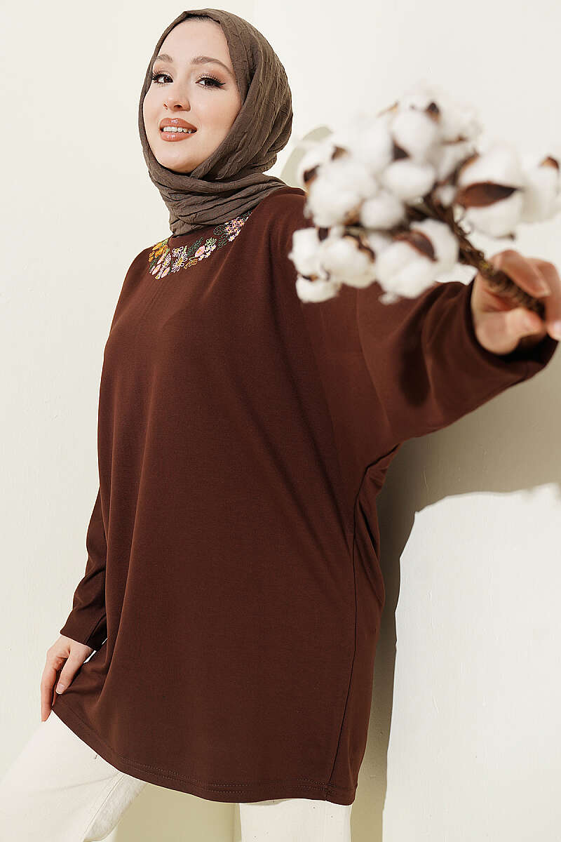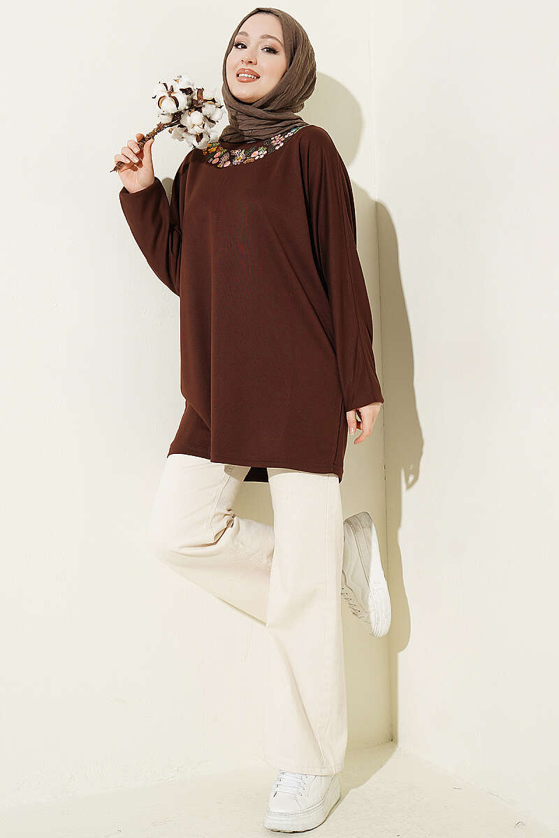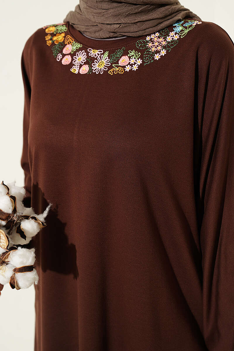 Bu şık loyşa tunik, bisiklet yakasını çevreleyen rengarenk çiçek nakışları ile tasarıma canlı ve feminen bir dokunuş katar. Rahatlığı ön plana çıkaran dökümlü kesimi ve salaş formu, hareket özgürlüğü sunarken aynı zamanda modern bir siluet oluşturur. Tasarımın en dikkat çekici özelliklerinden biri olan geniş yarasa kollar, tuniğe çabasız bir zarafet kazandırarak hem günlük kombinlerde hem de daha özel okazyonlarda tercih edilebilecek konforlu bir seçenek sunar.