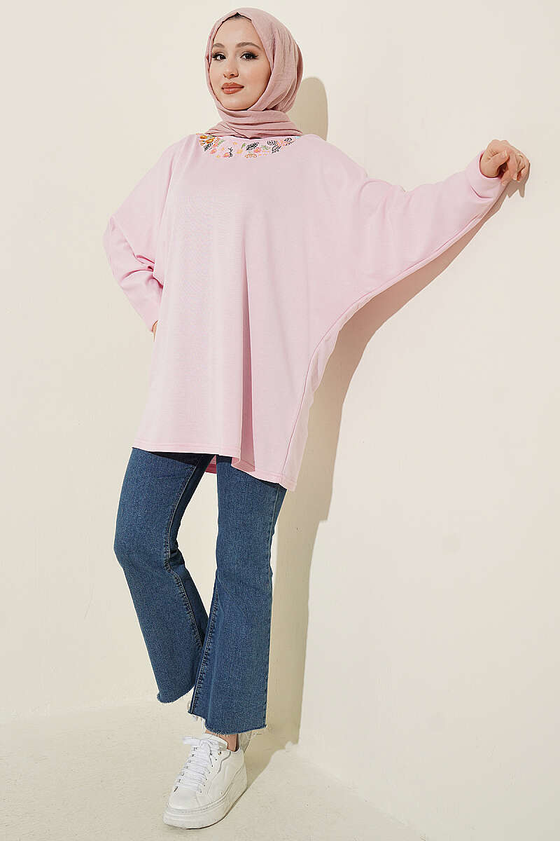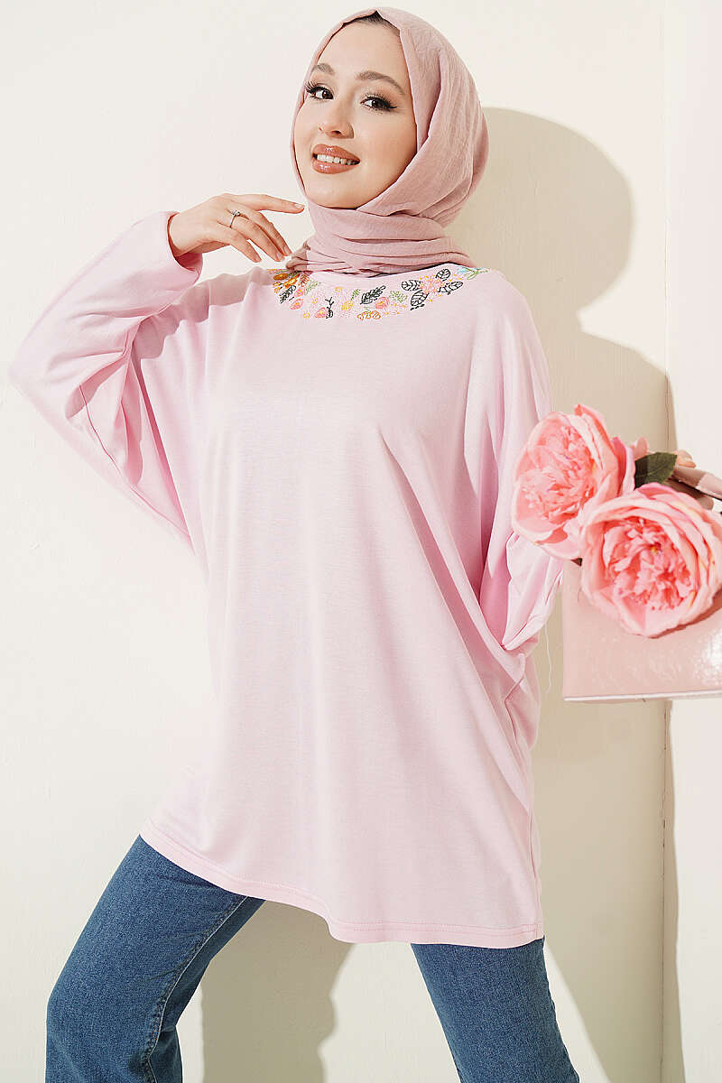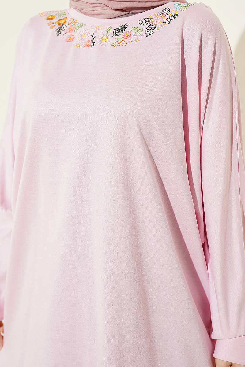 Yakası Çiçek Nakışlı Loyşa Tunik Pembe