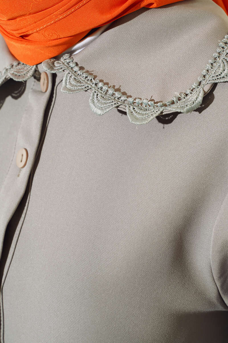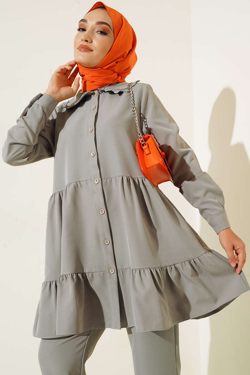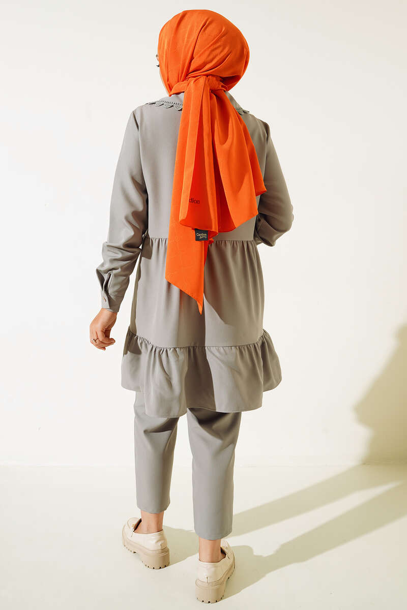 Yakası Dantel Detaylı Pantolonlu Takım Gri