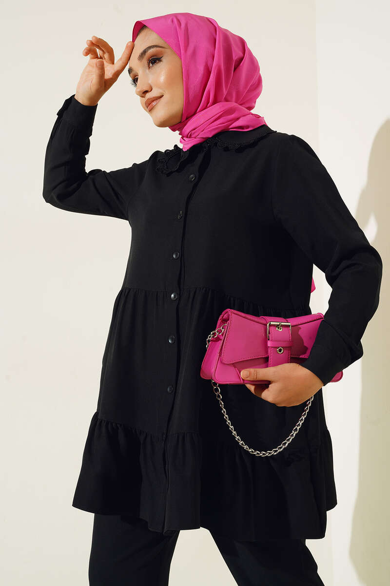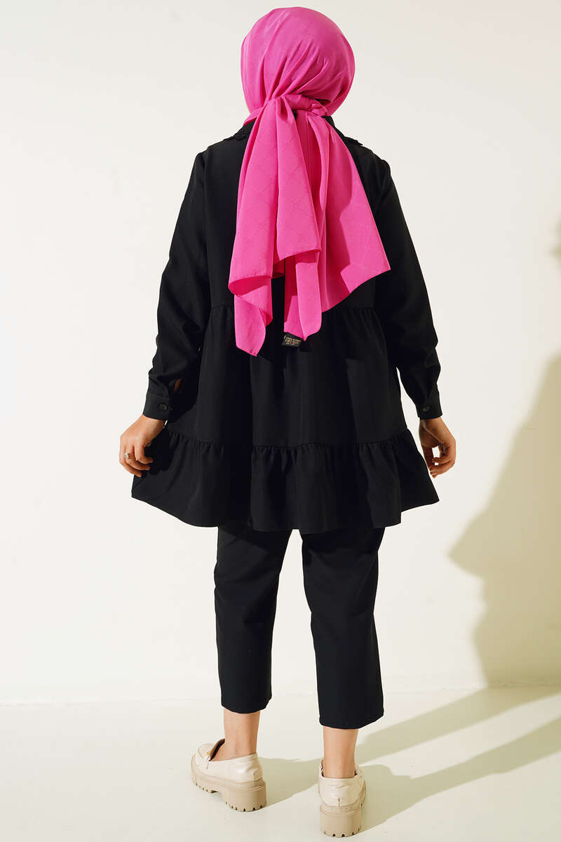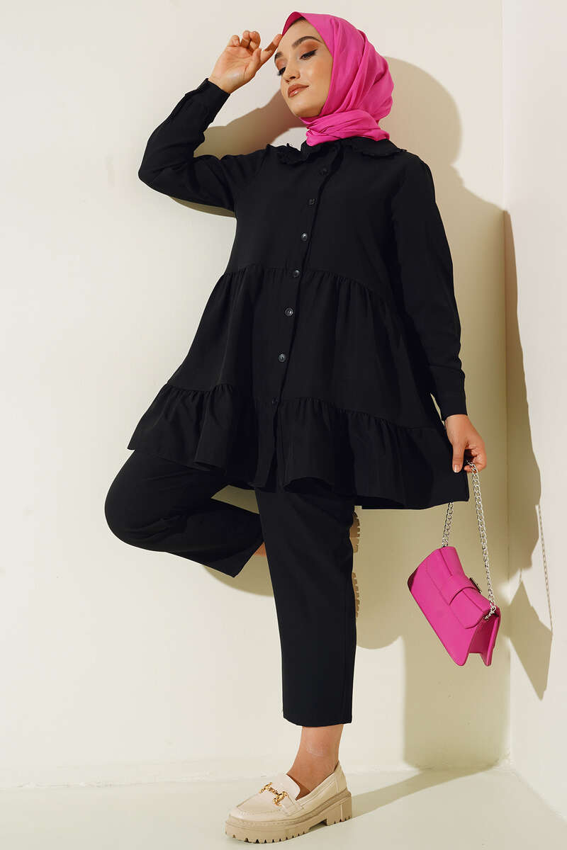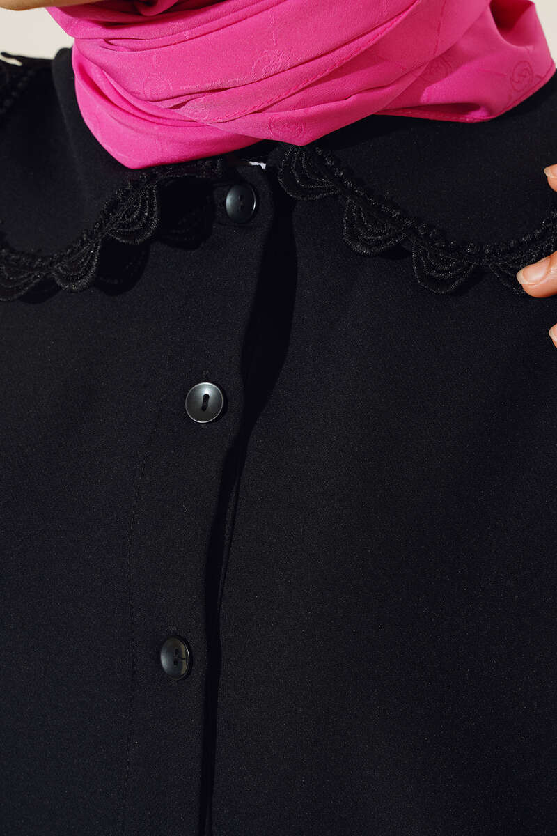 Yakası Dantel Detaylı Pantolonlu Takım Siyah