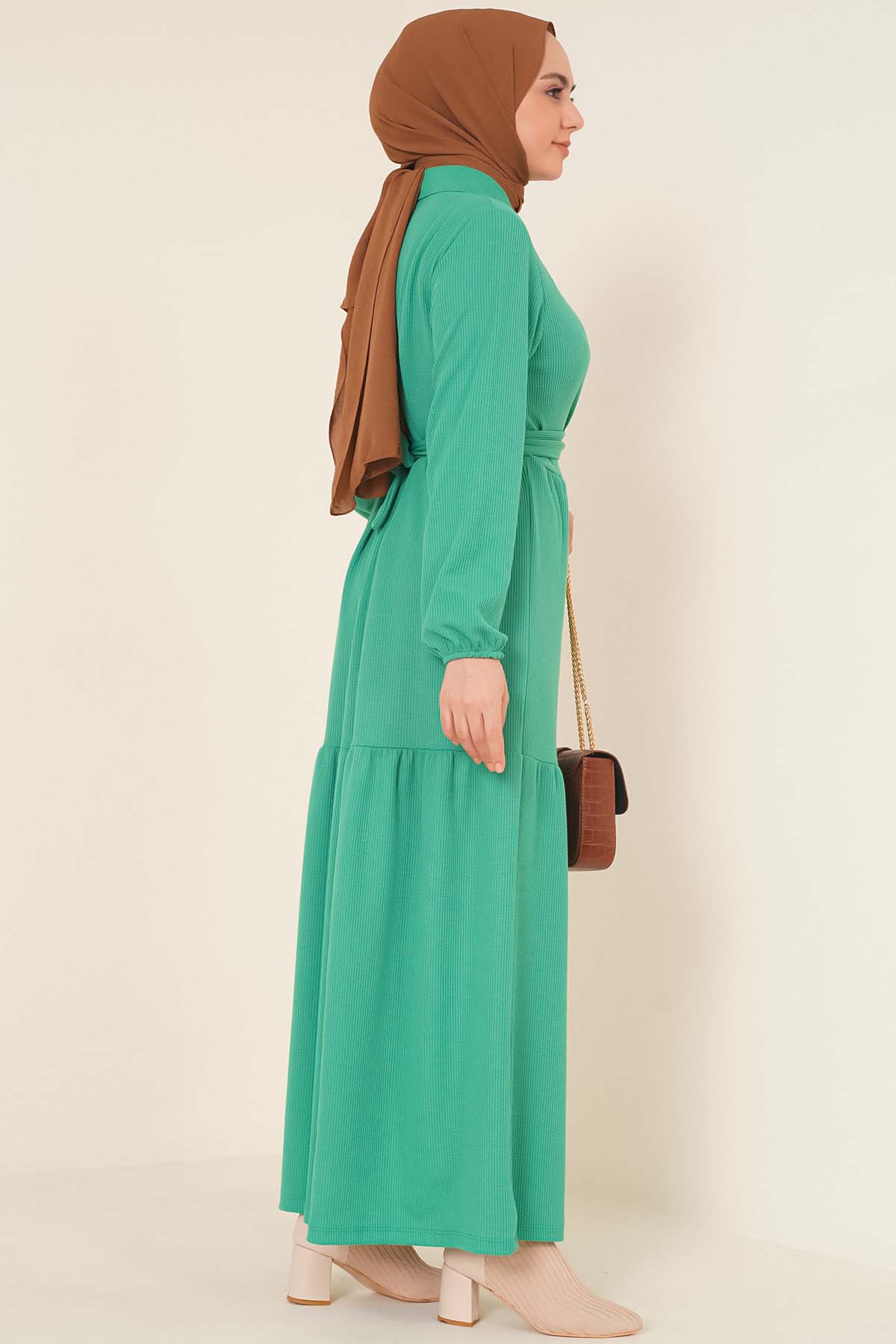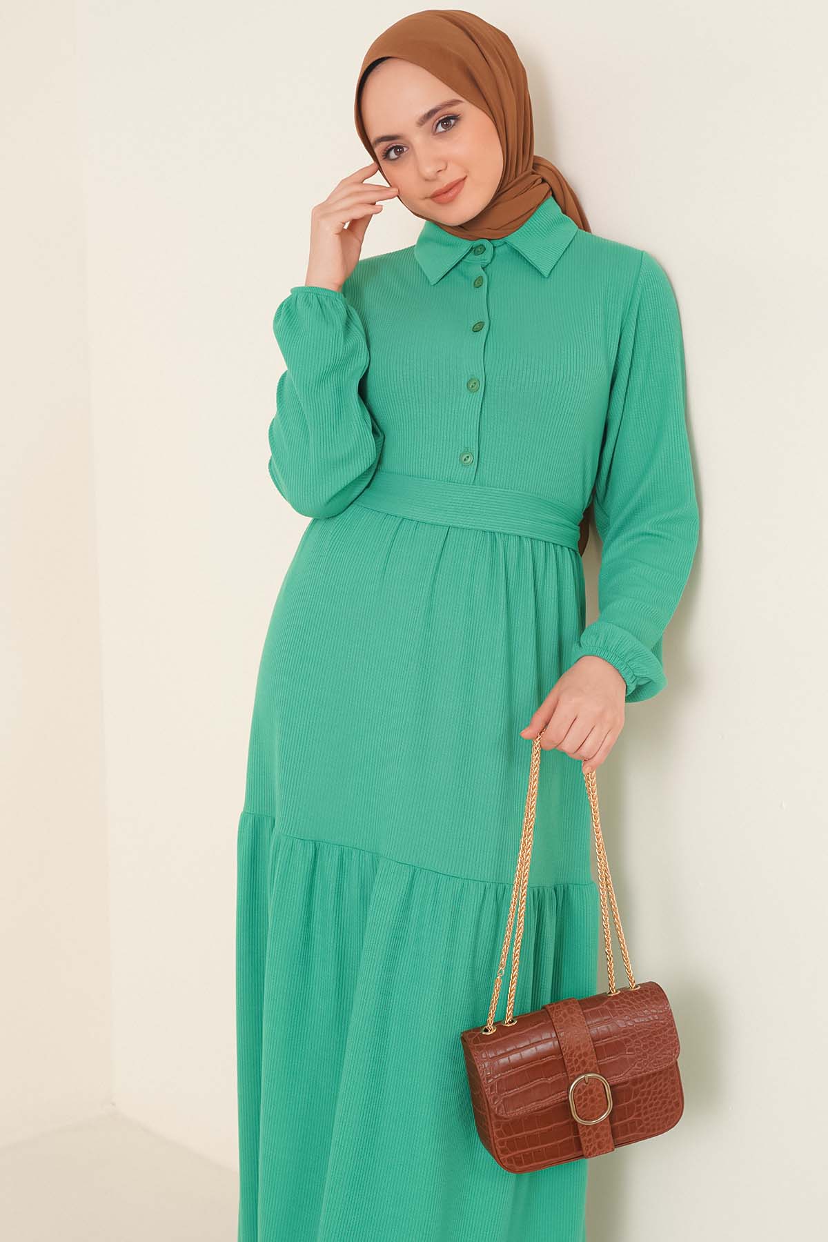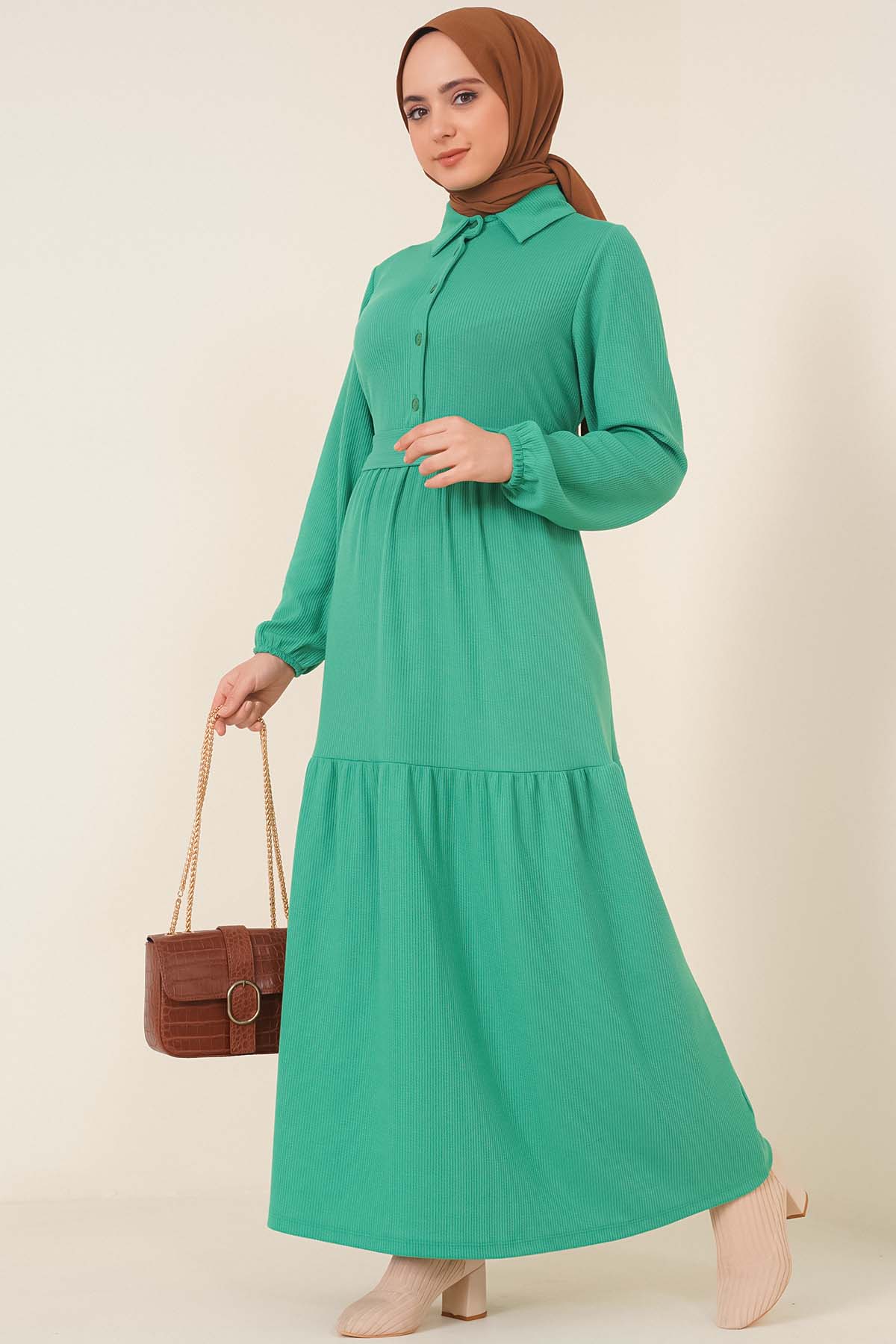 Yakası Düğmeli Bürümcük Elbise Yeşil