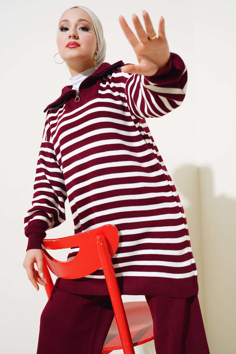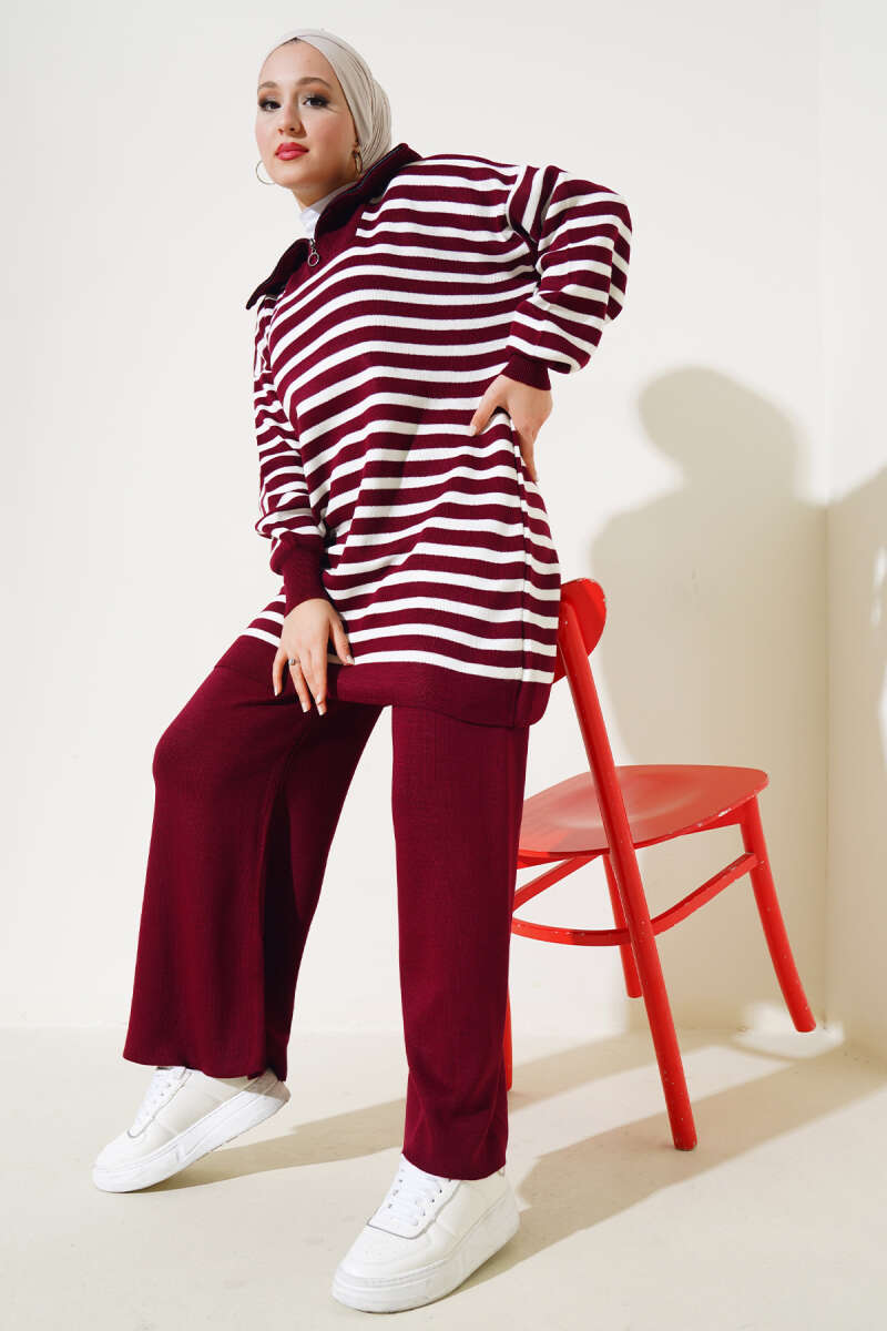 Çizgili Bolerolu Triko İkili Takım Bordo