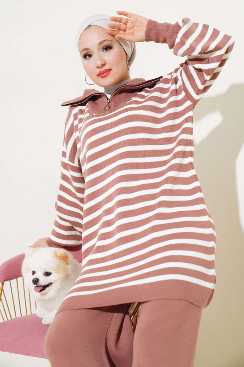 Balon Kol Balıkçı Yaka Triko İkili Takım Kahve