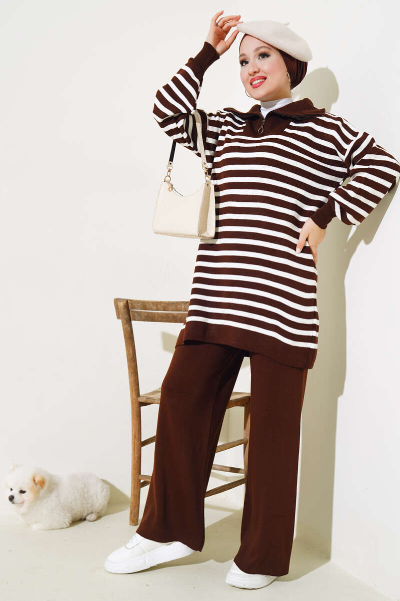 Çizgili Bolerolu Triko İkili Takım Kahverengi