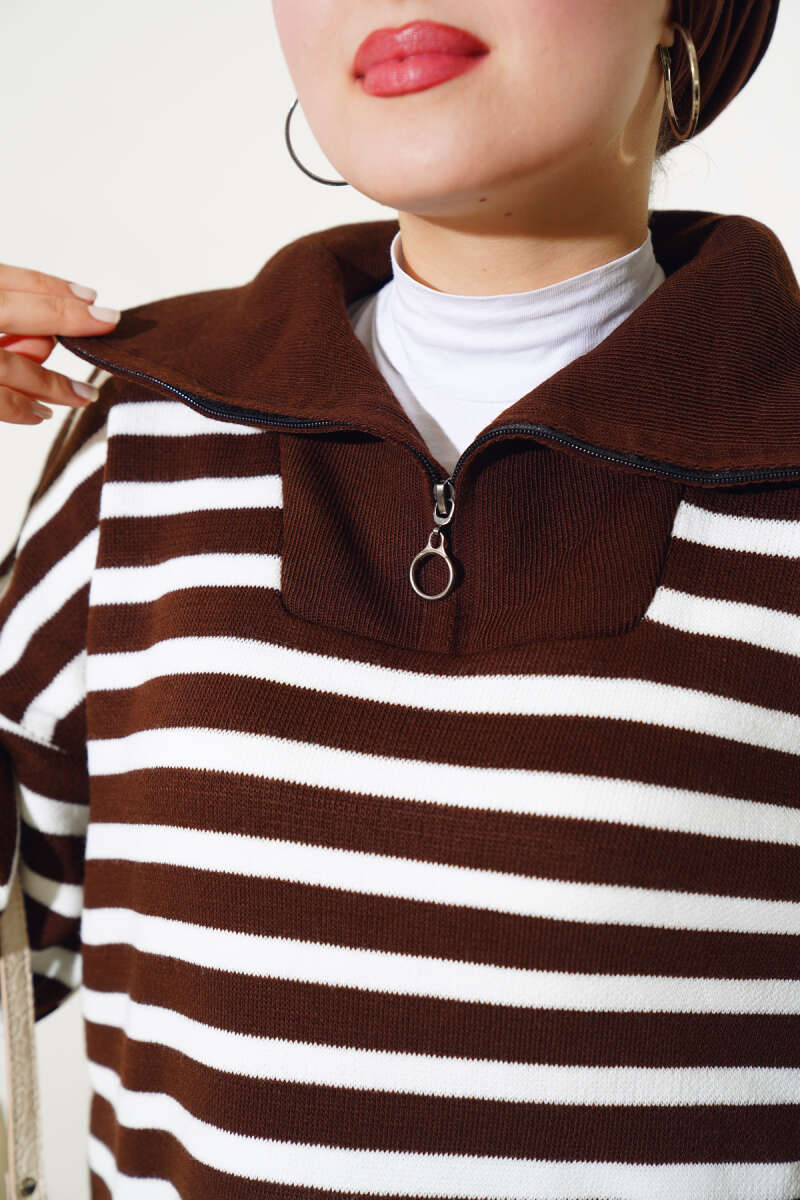Yakası Fermuarlı Çizgili Triko İkili Takım Büsküvi
