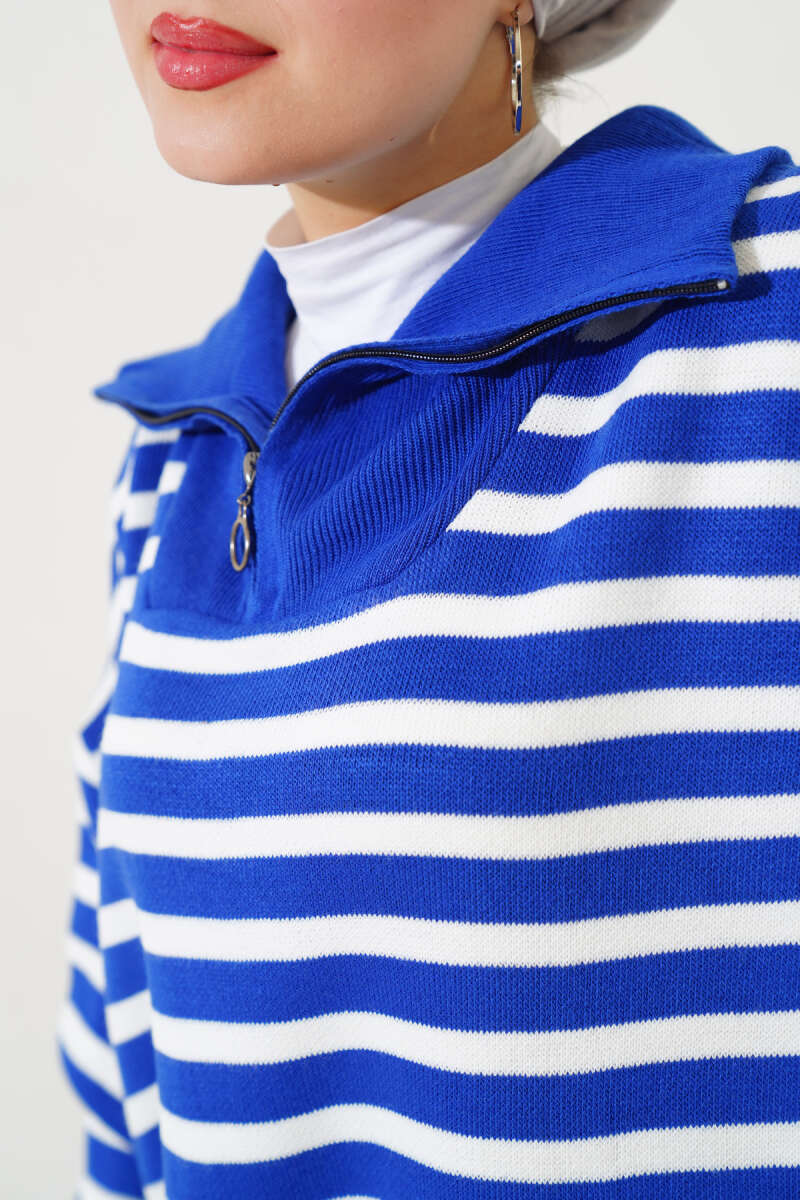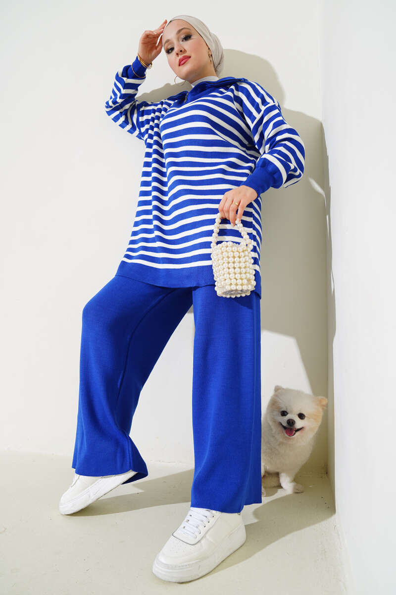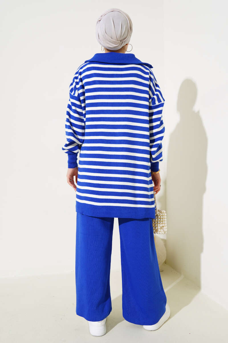 Yakası Fermuarlı Çizgili Triko İkili Takım Taş
