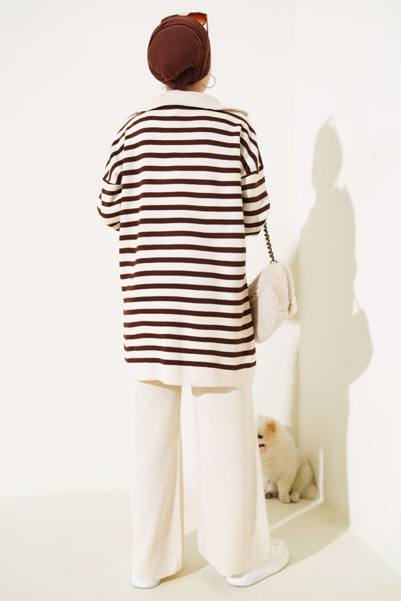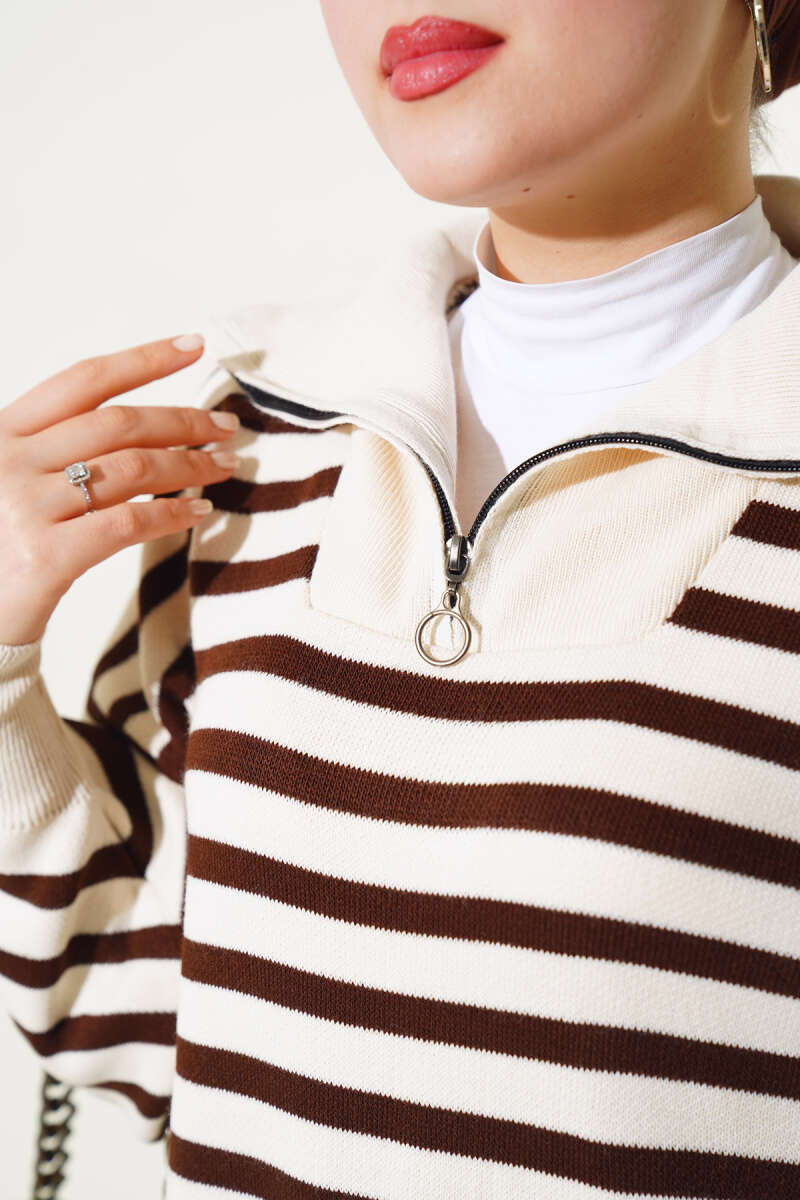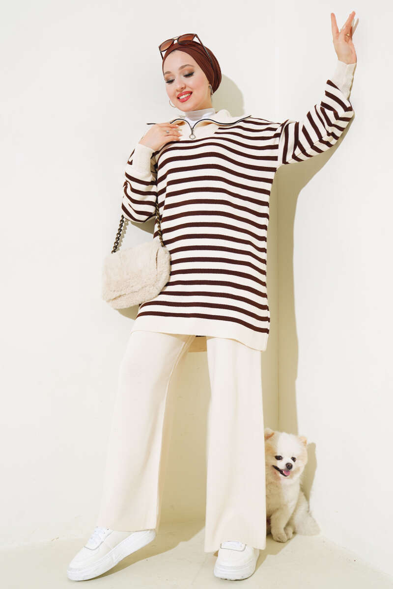 Yakası Fermuarlı Çizgili Triko İkili Takım Taş
