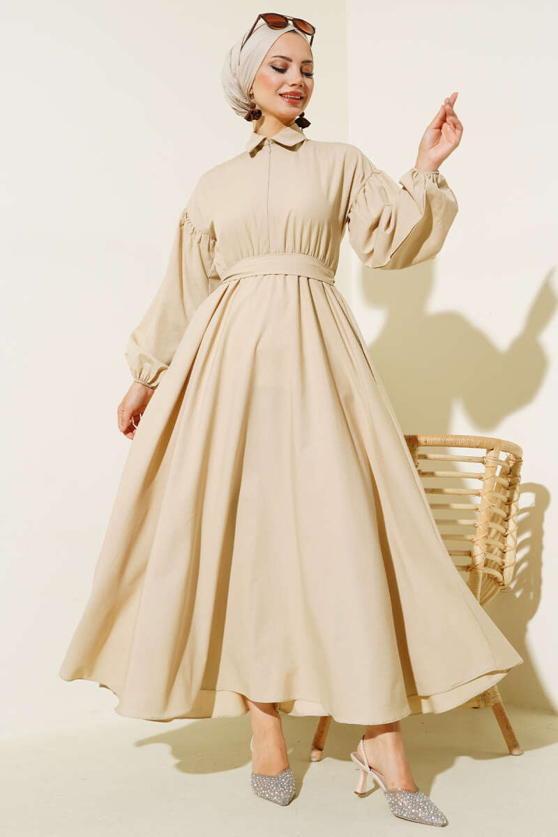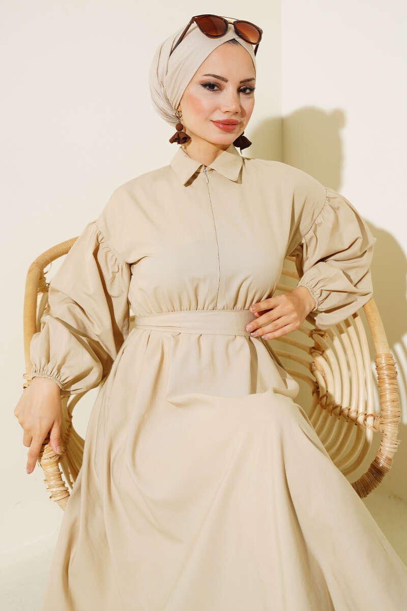 Yakası Fermuarlı Terikoton Elbise Bej