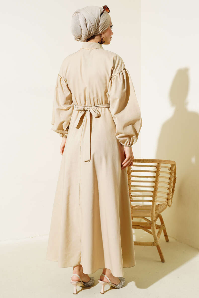 Boydan Düğmeli Kemerli Tensel Elbise Latte