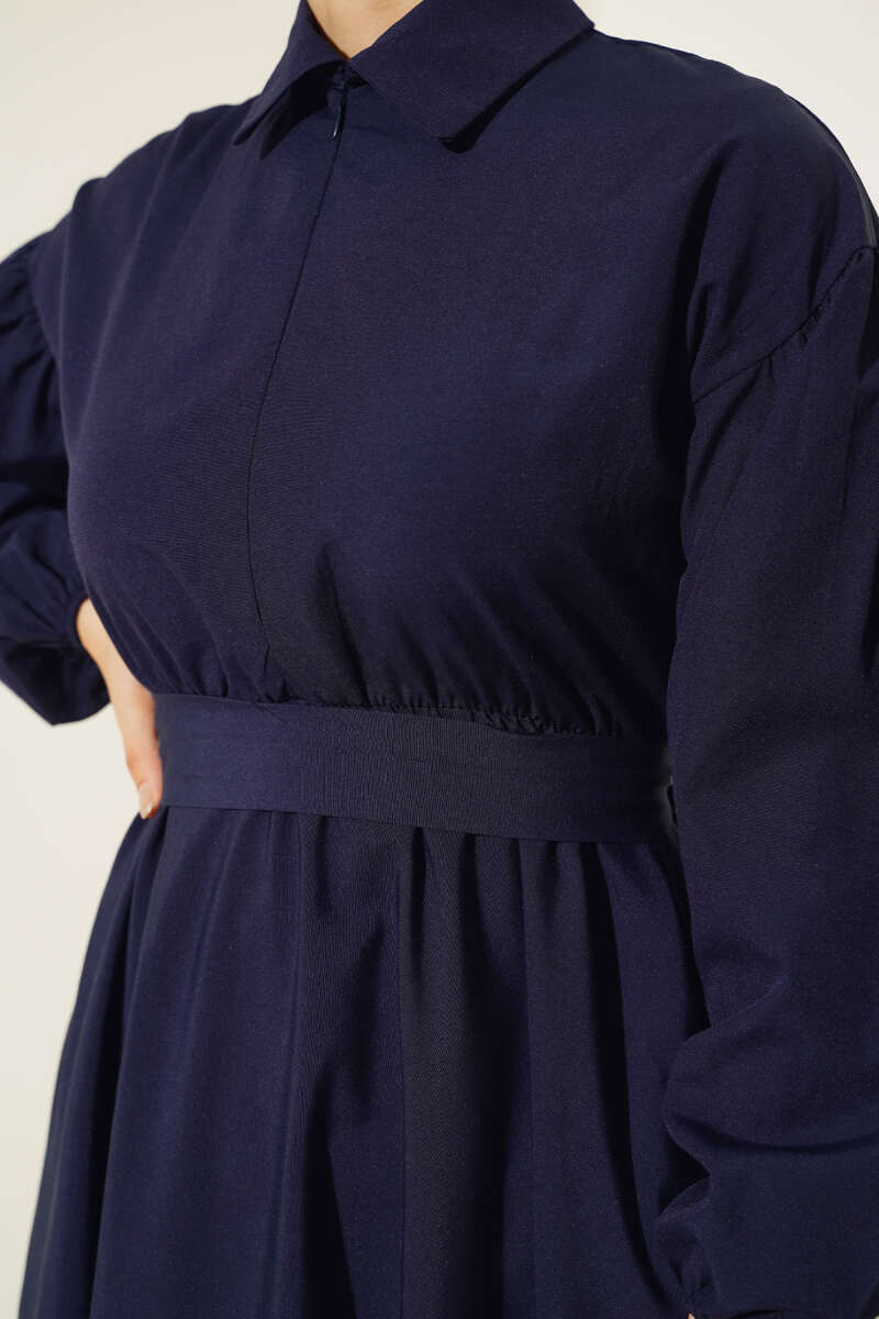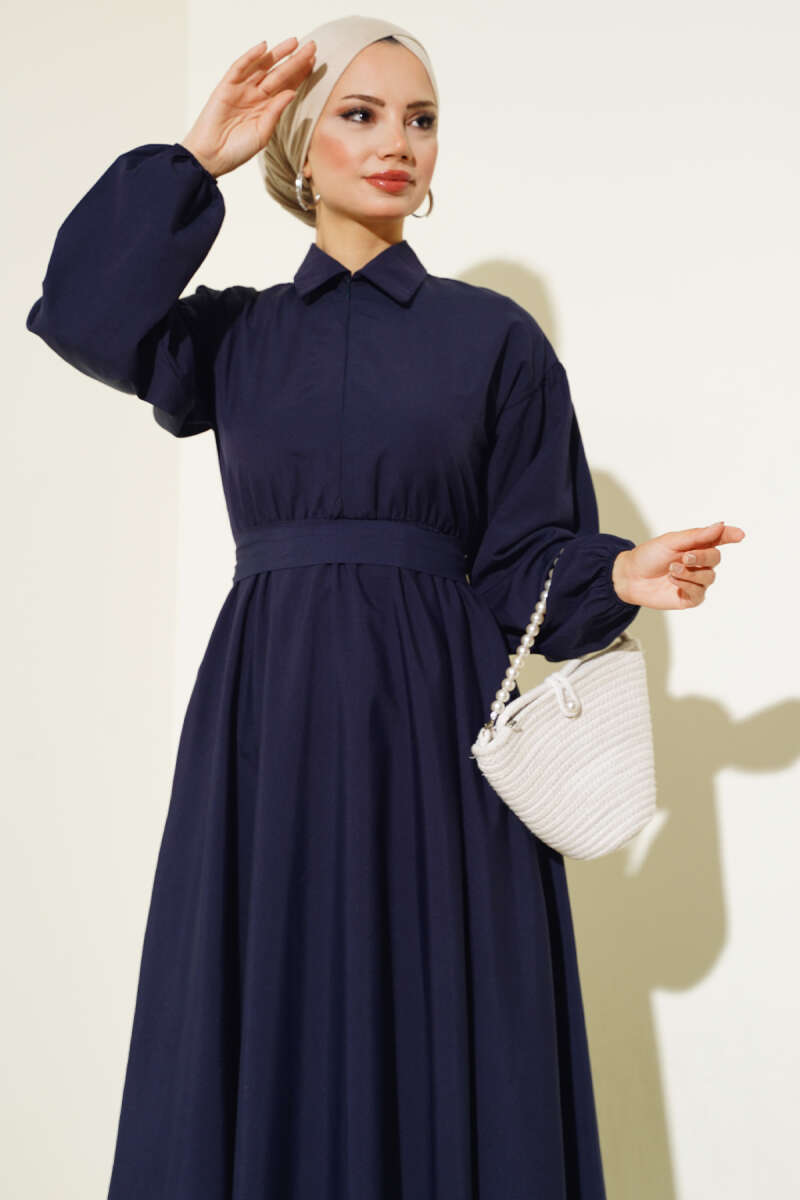 Boydan Düğmeli Kemerli Tensel Elbise İndigo