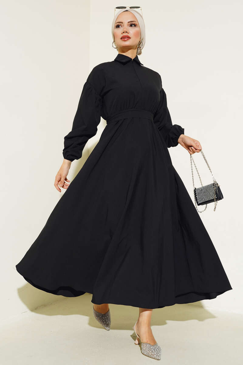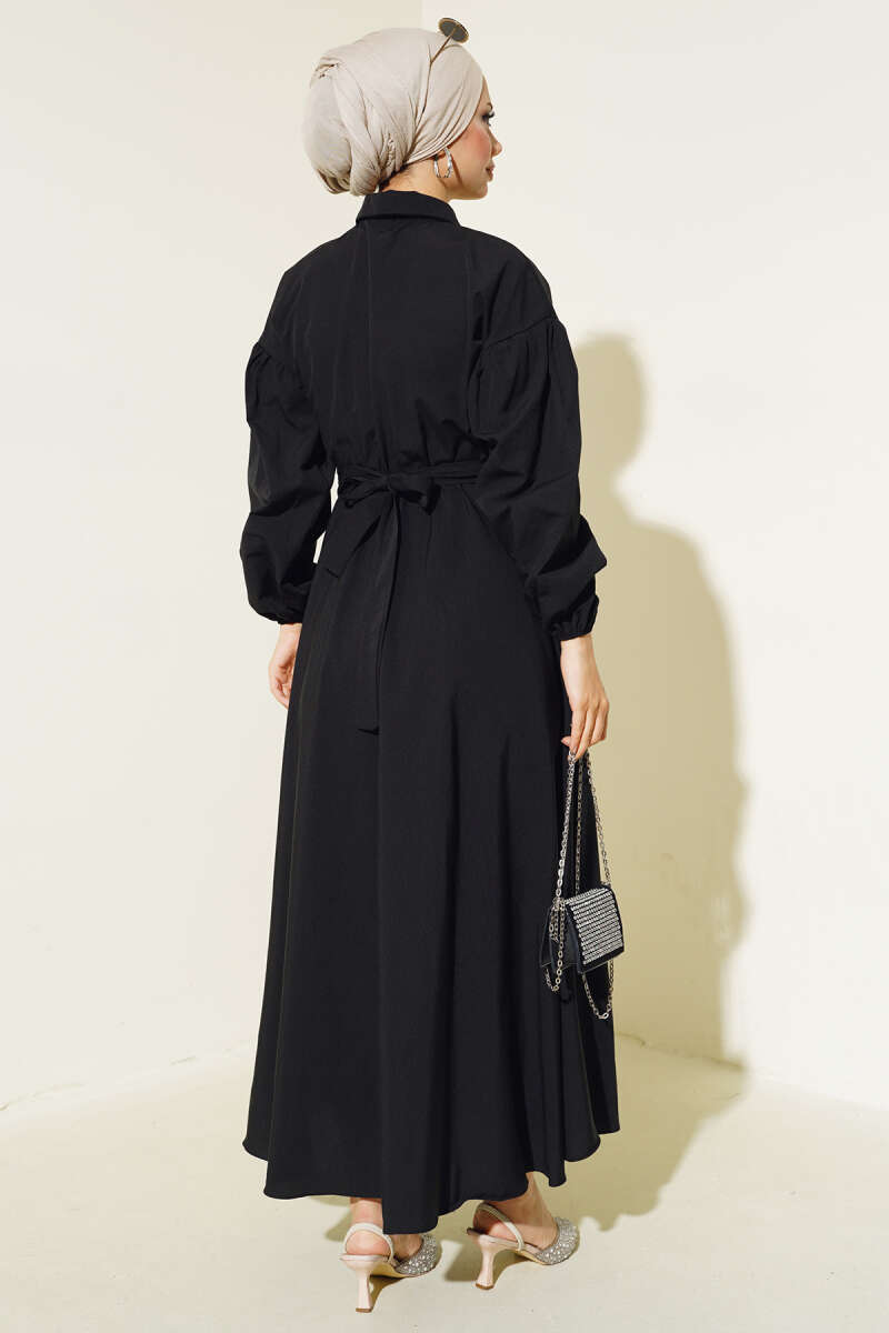 Boydan Düğmeli Kemerli Tensel Elbise Siyah