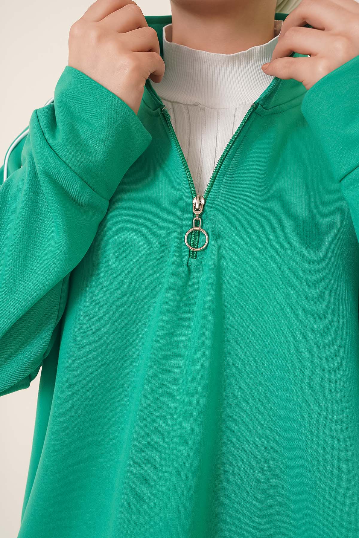Yeni sezon model yakası fermuarlı tuniğimiz sportif dokunuşlarla kombinlerinize etki edecektir. Düşük omuz model olan tuniğimiz boğazlı yakadır. Omuzlarından bileklerine doğru inen şeritleriyle tuniğimiz hareket kazanmıştır. Renk çeşitleri mevcuttur.