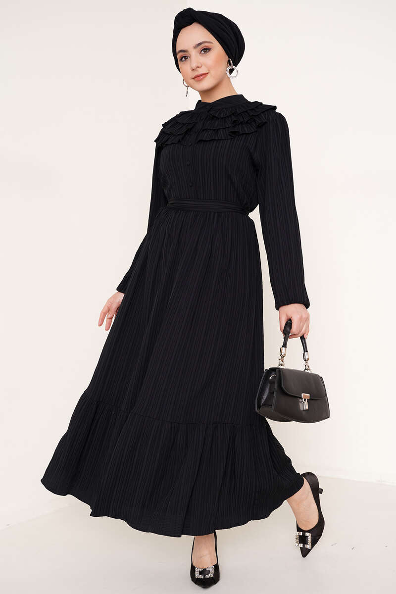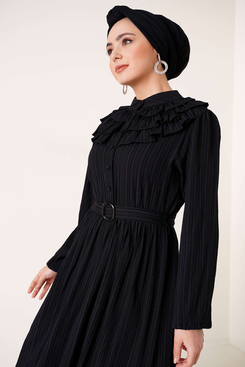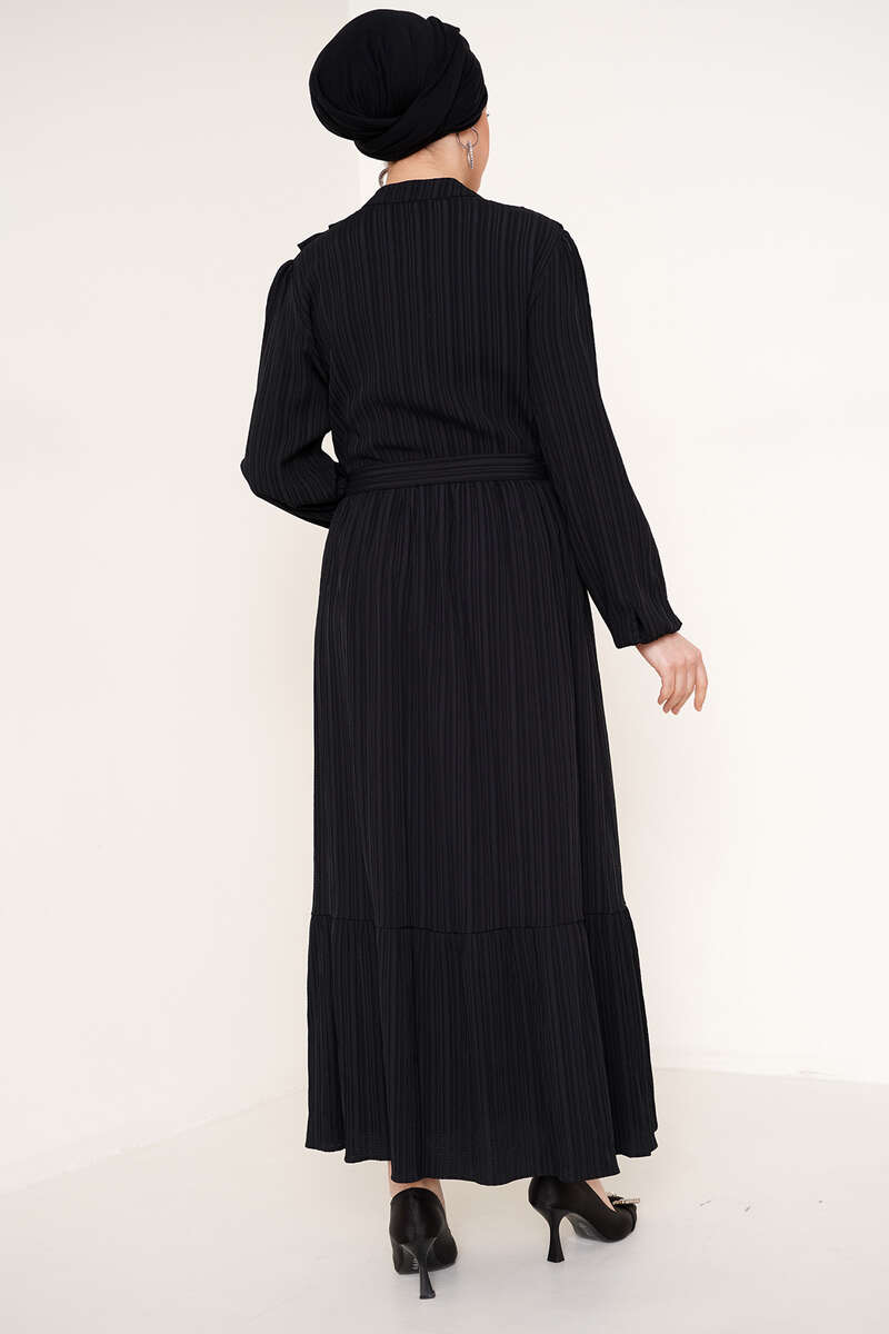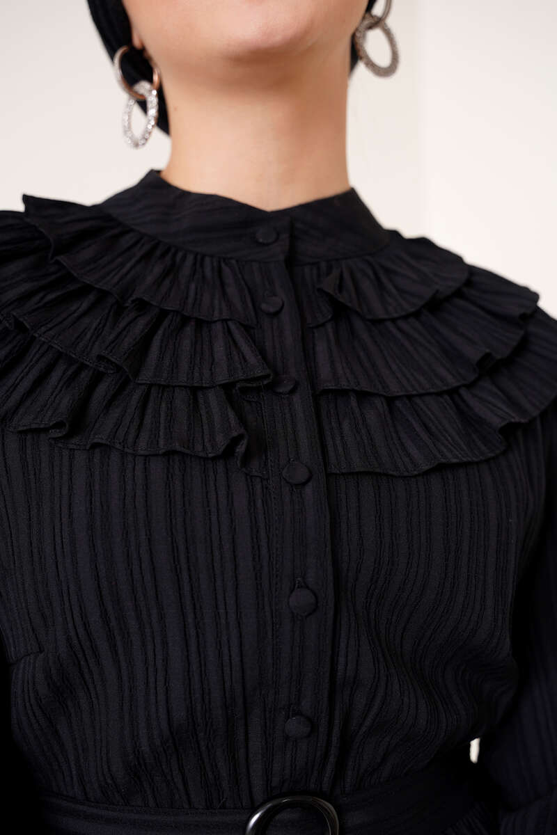 Yeni sezon elbise yakası katkat fırfır detayıyla dikkat çekmektedir. Önü yarım düğmelidir. Beli kuşaklı olan elbisemiz hakim yakadır. İki adet kemer köprüsü bulunmaktadır. Bilek manşetleri düğmelidir.