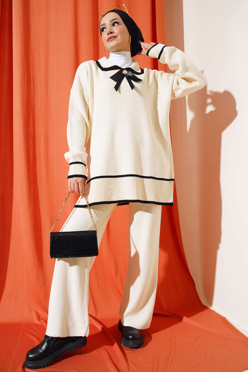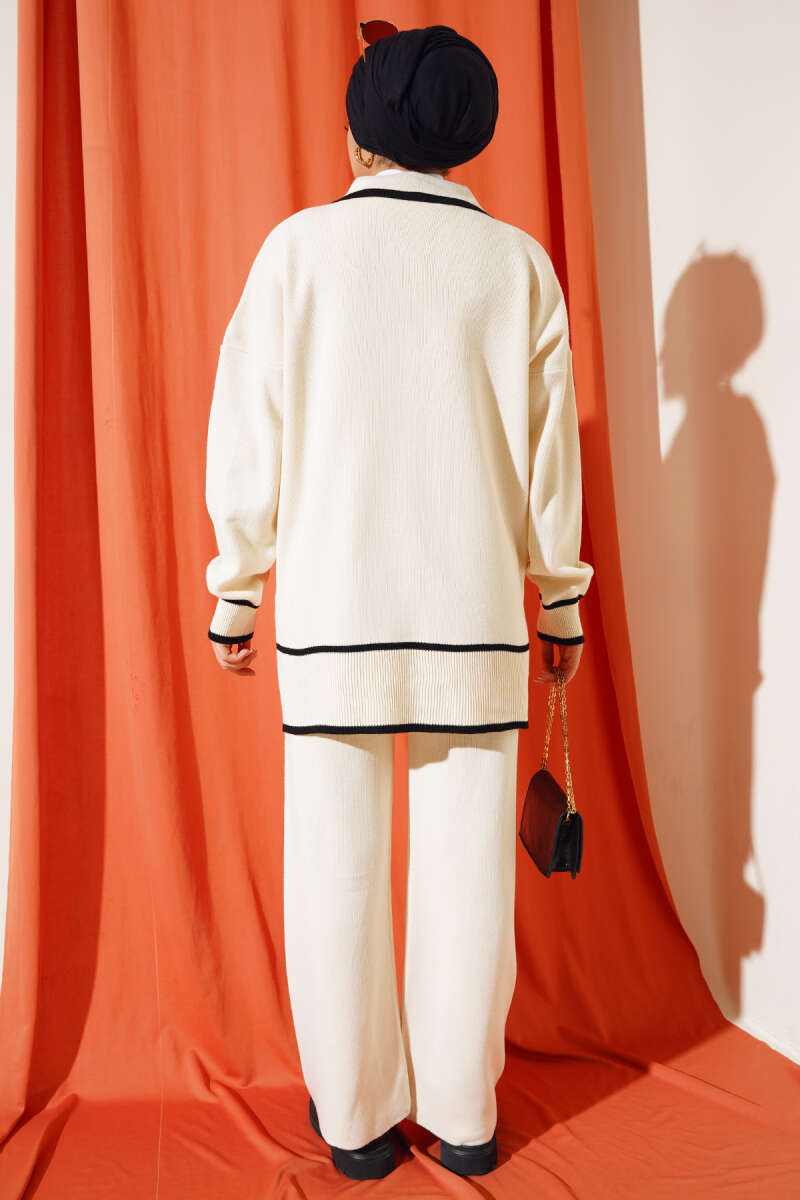 Kabartma Şeritli Taşlı Triko İkili Takım Nefti