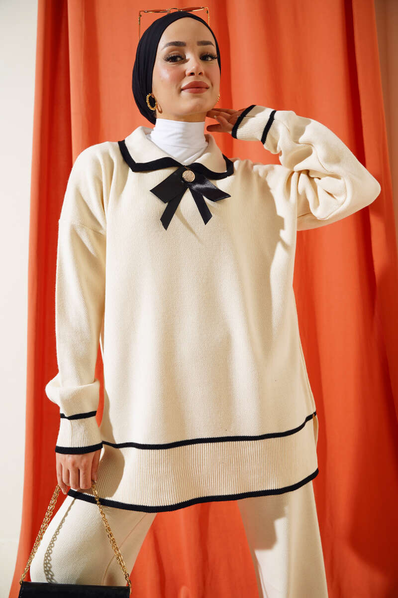 Dikiş Detaylı Basic Triko İkili Takım Bej