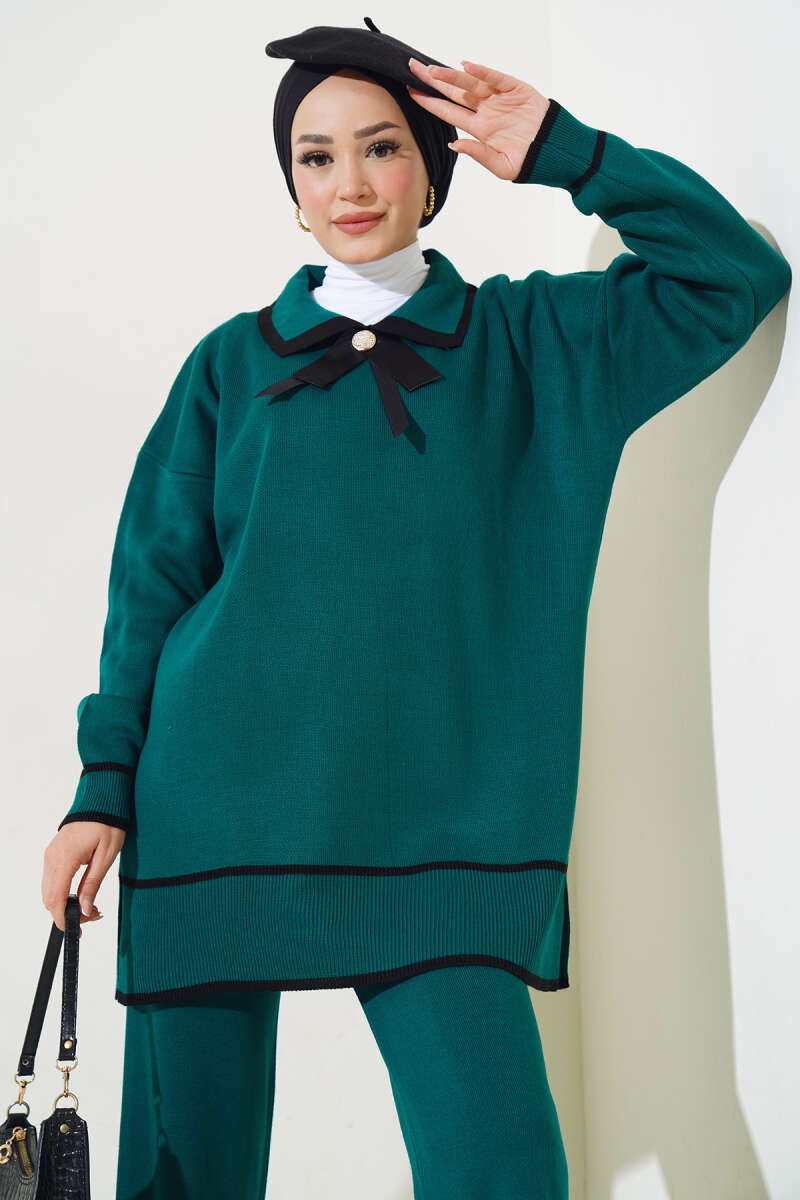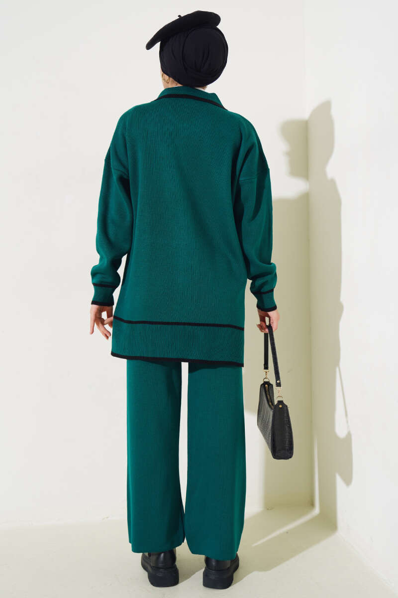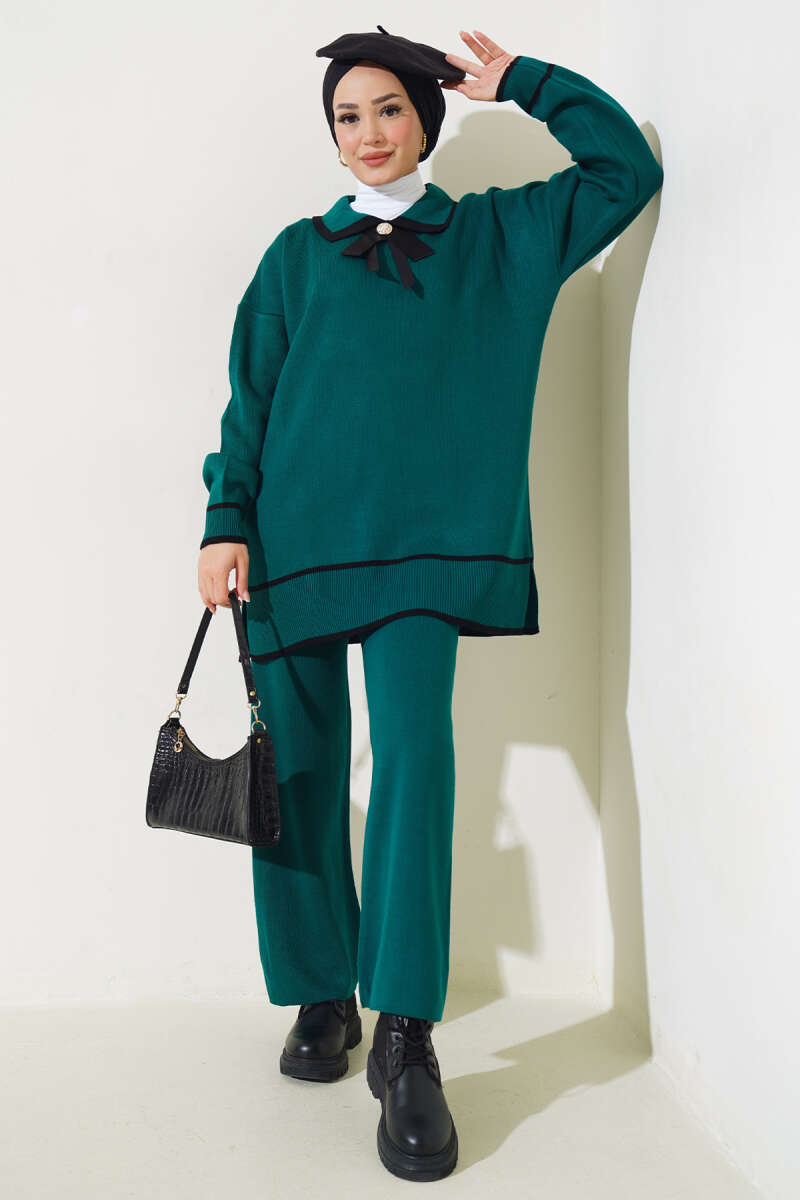Taşlı Baklava Desen Triko İkili Takım Zümrüt