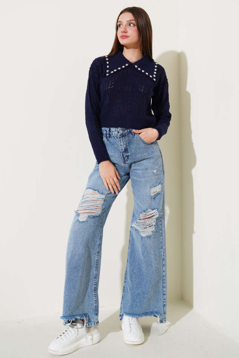 Uzun Kollu Yarım Fermuarlı Bluz Mavi
