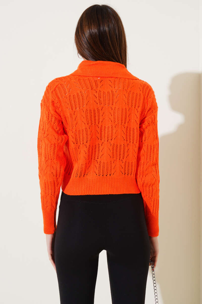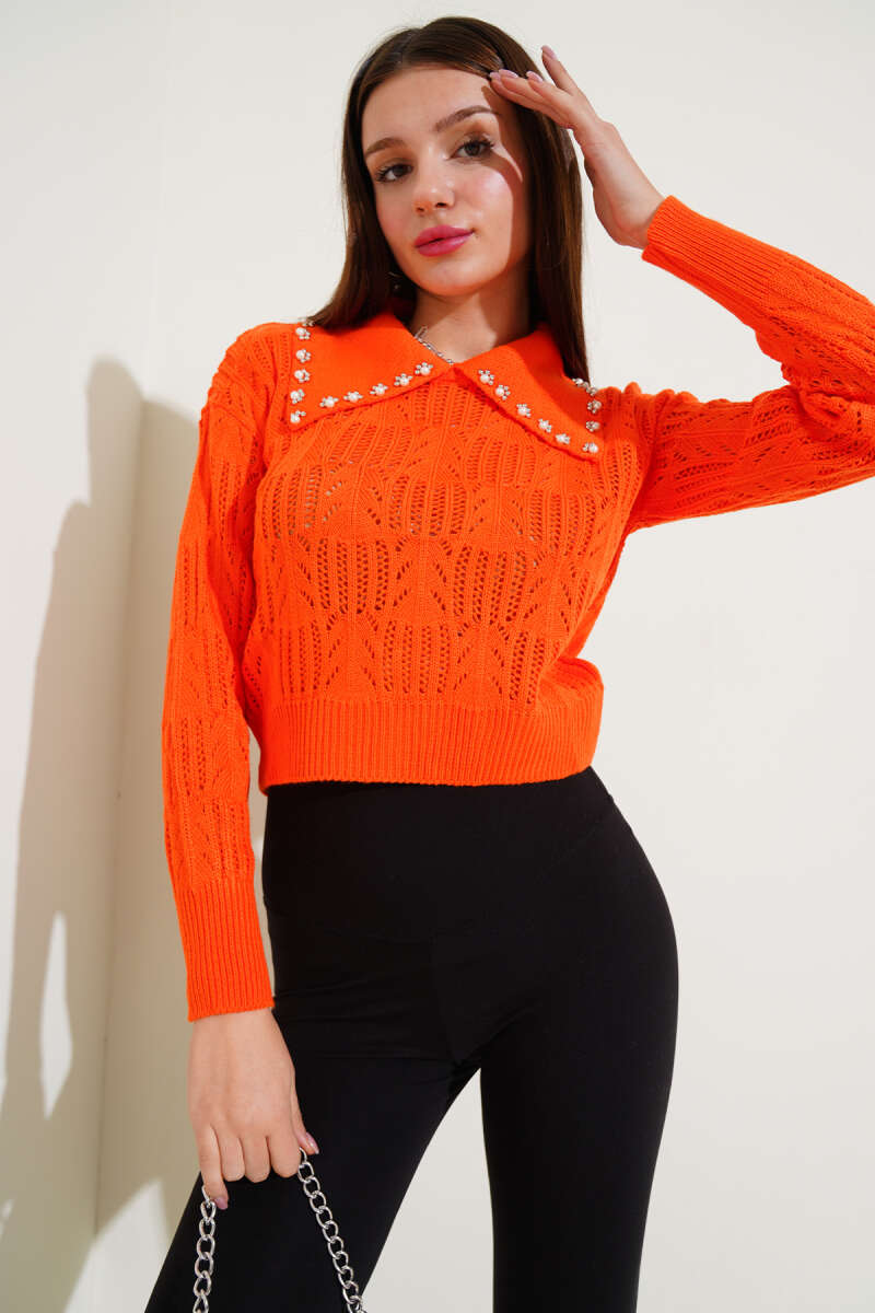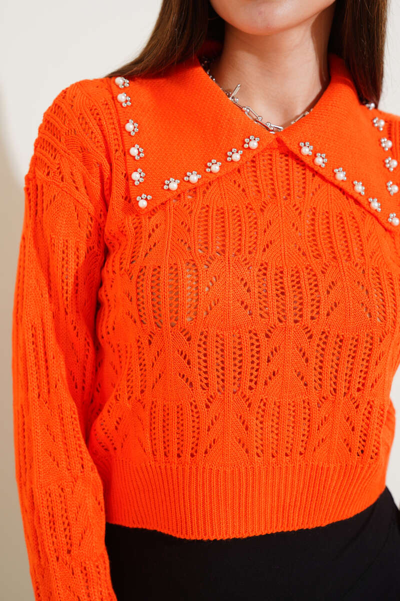 Yakası İnci Süslemeli Delikli Kazak Kahve