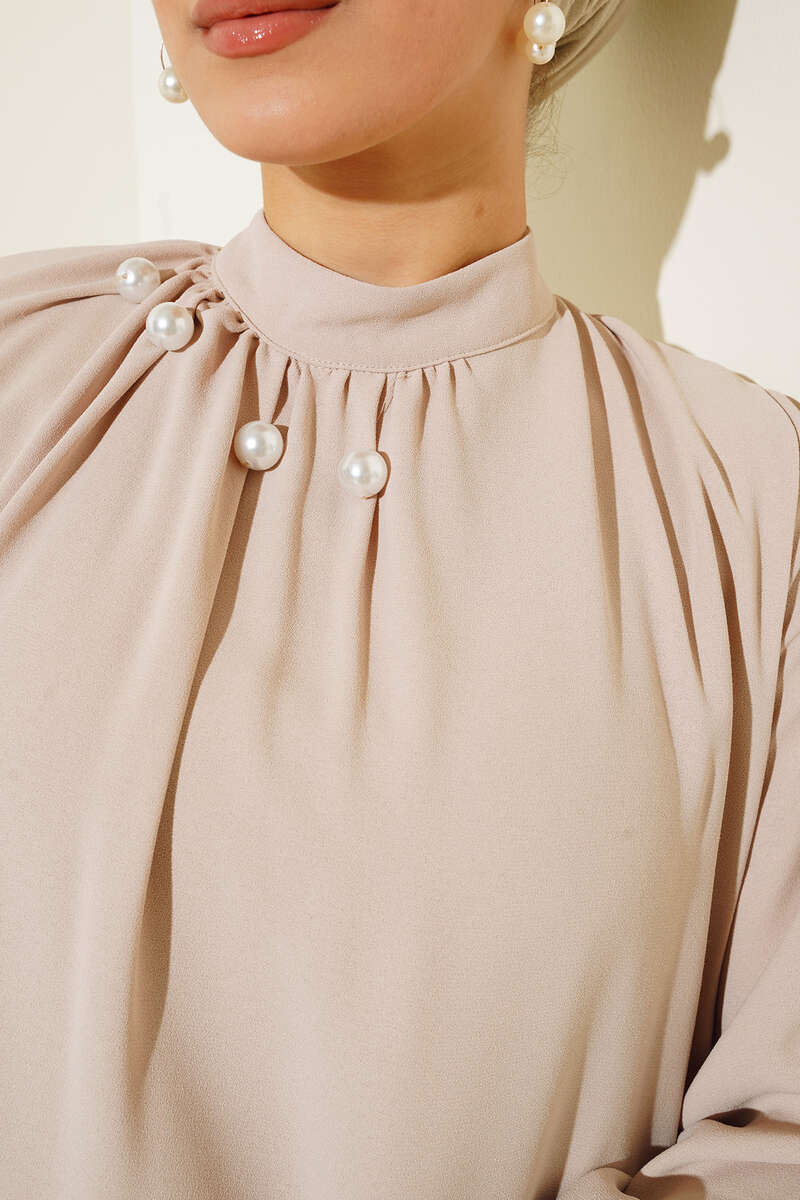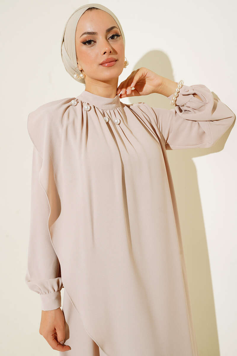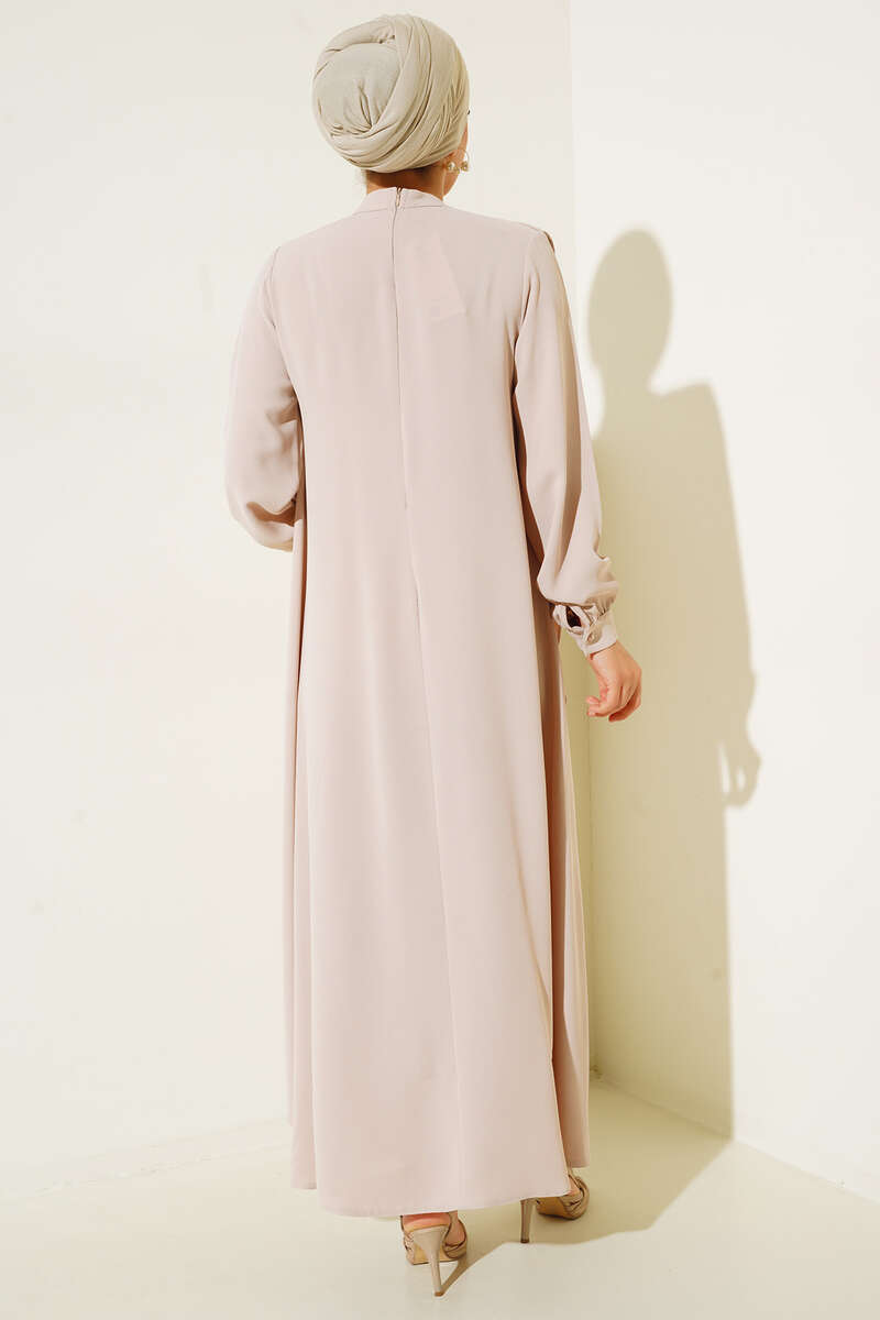 Yakası İncili Elbise Bej