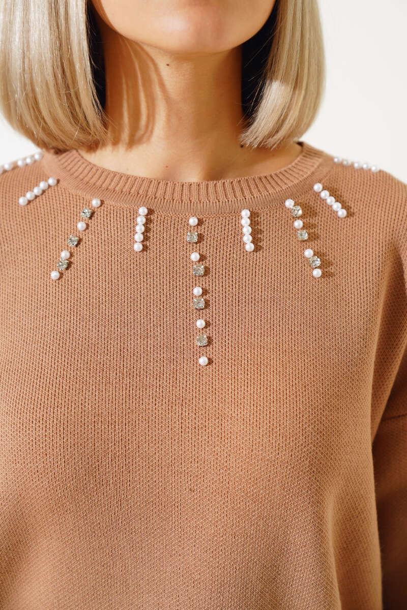 Yakası İncili Taşlı Triko Crop Kazak Büsküvi