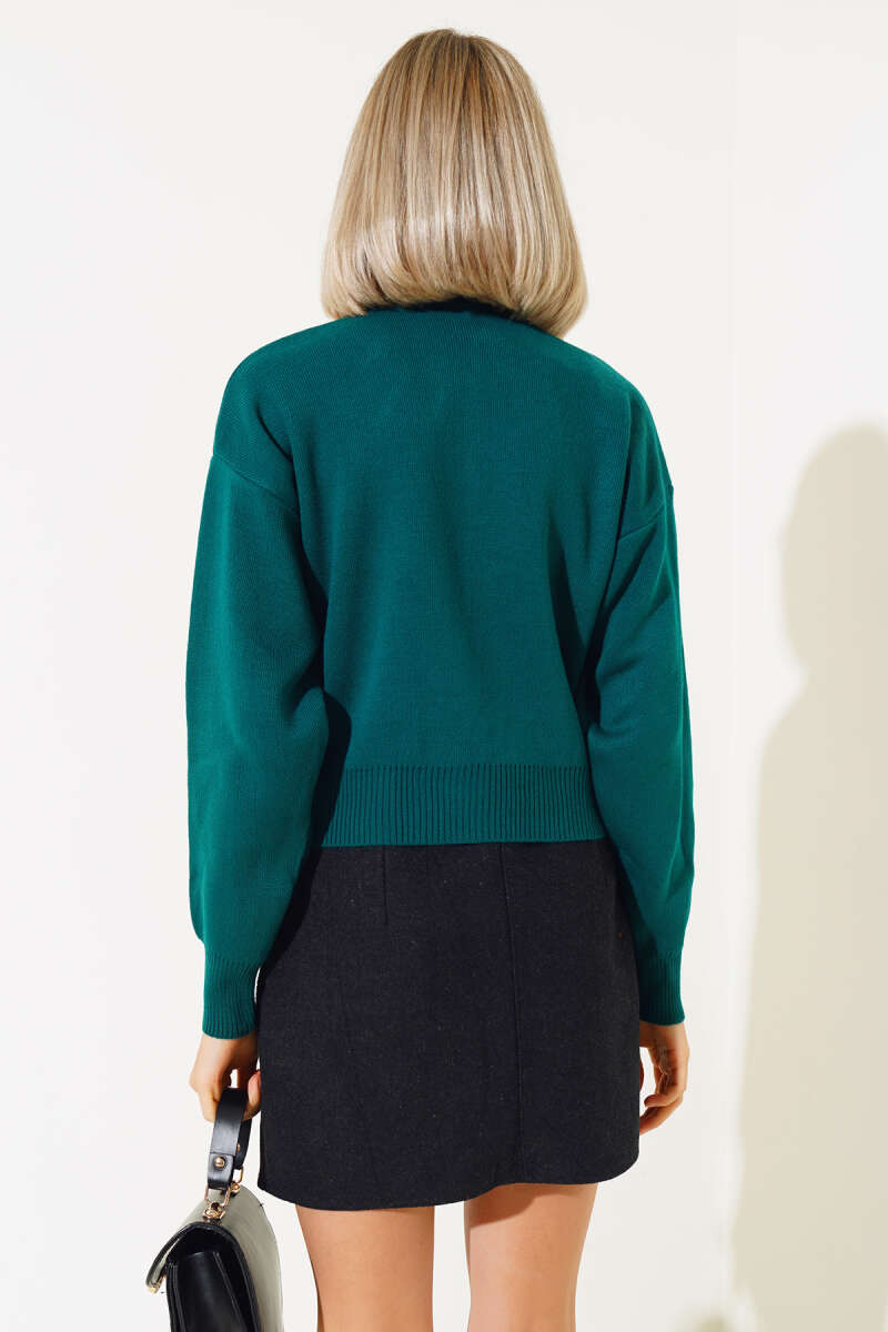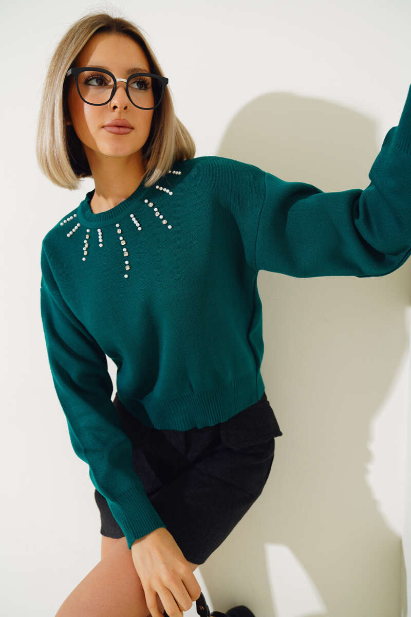 Yakası İncili Taşlı Triko Crop Kazak Zümrüt