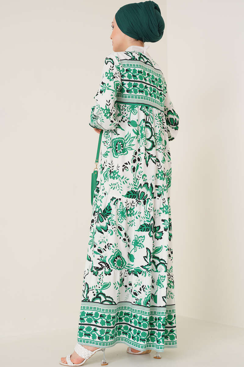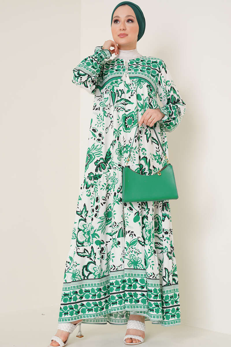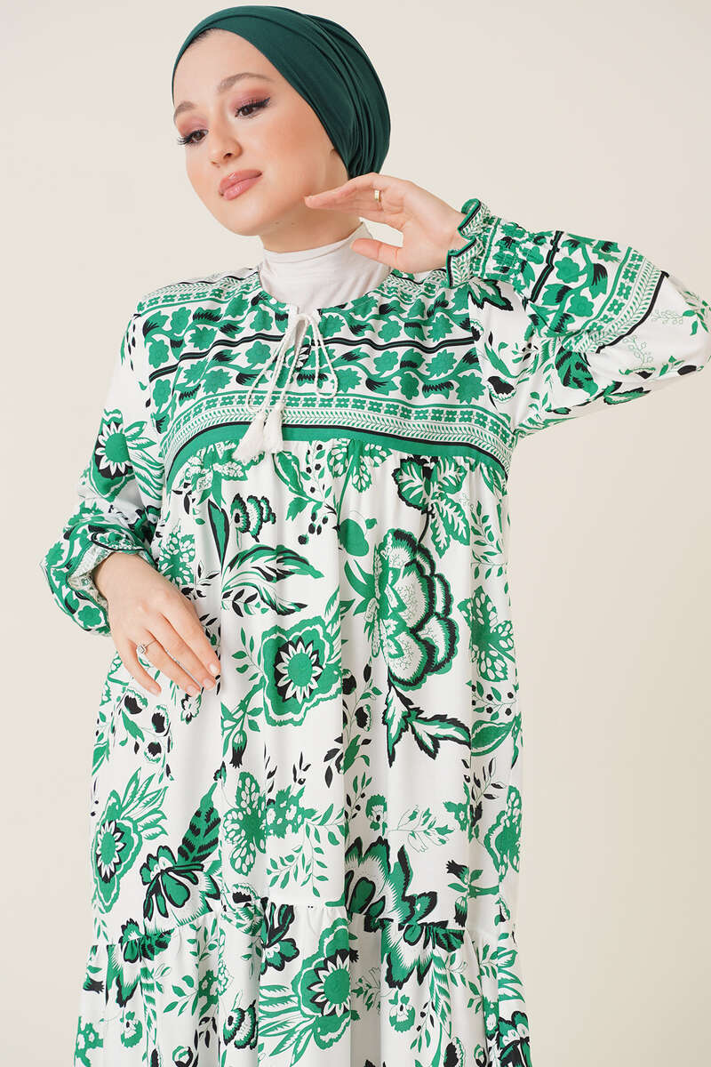 Yeni sezon elbisemiz etnik çiçek desenleriyle günlük hayatınızı ışıldatacak. Yakası püsküllü ip bağlamalı olan elbisemizin bilekleri gipelidir. Sportif şıklığı ve rahatlığı size sunan elbisemiz sezonun favorileri arasındadır.