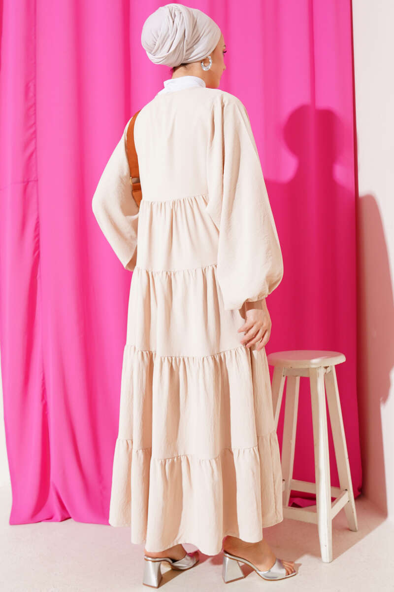 Çizgi Gömlek Garnili Triko Elbise Bej