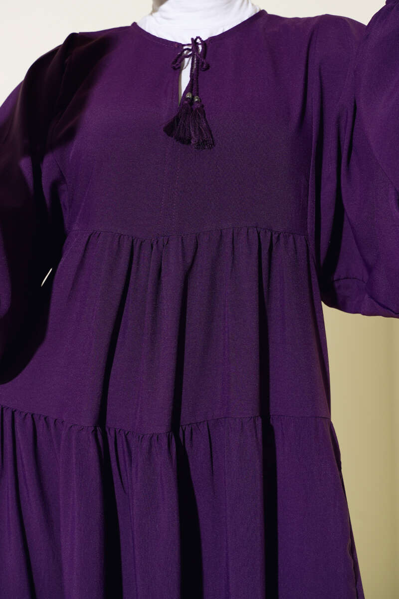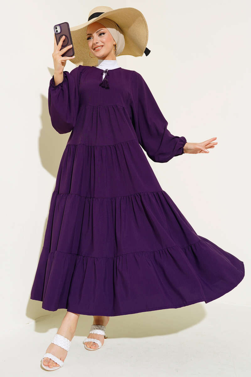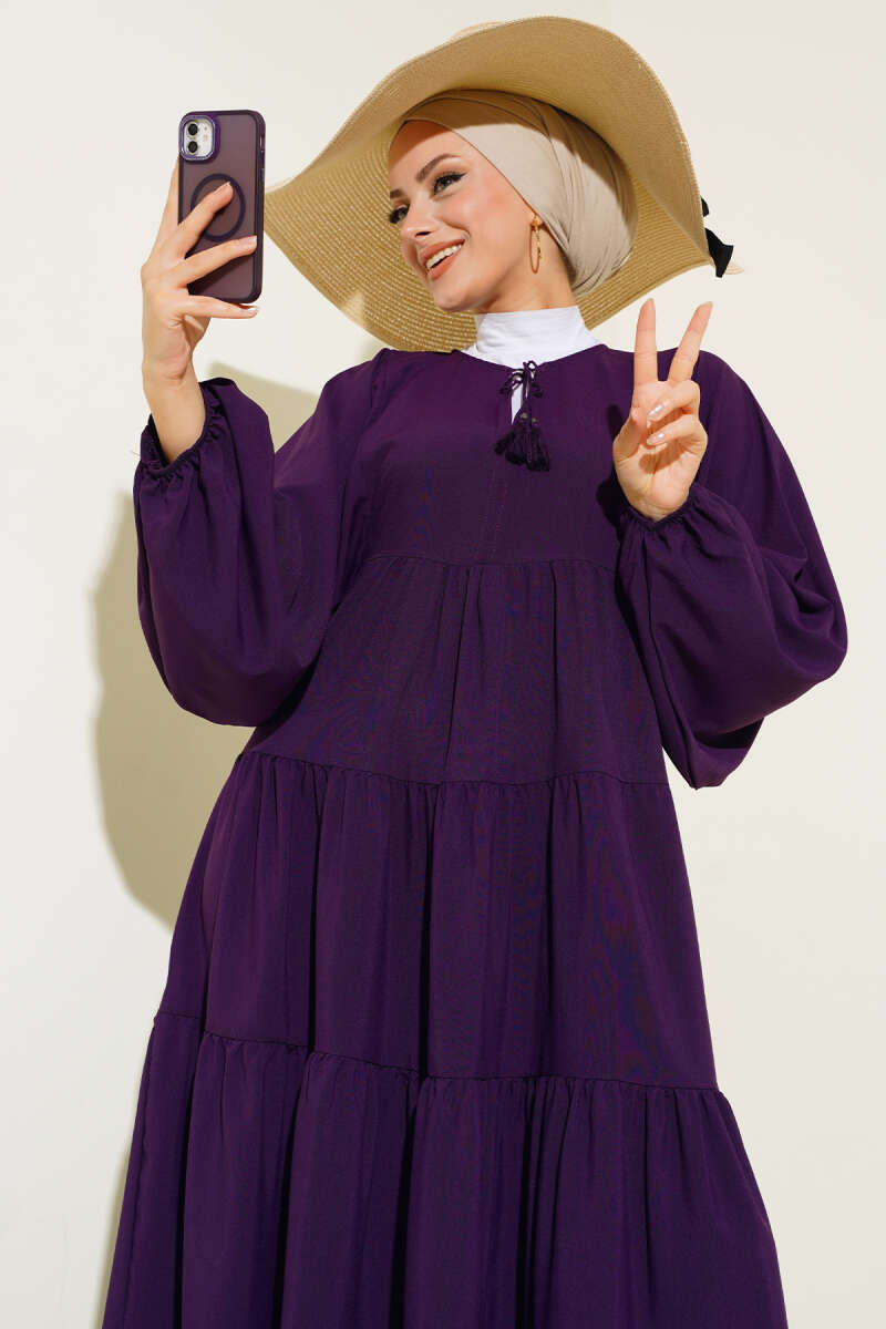 Kuşaklı Ekose Desenli Kloş Elbise Mürdüm
