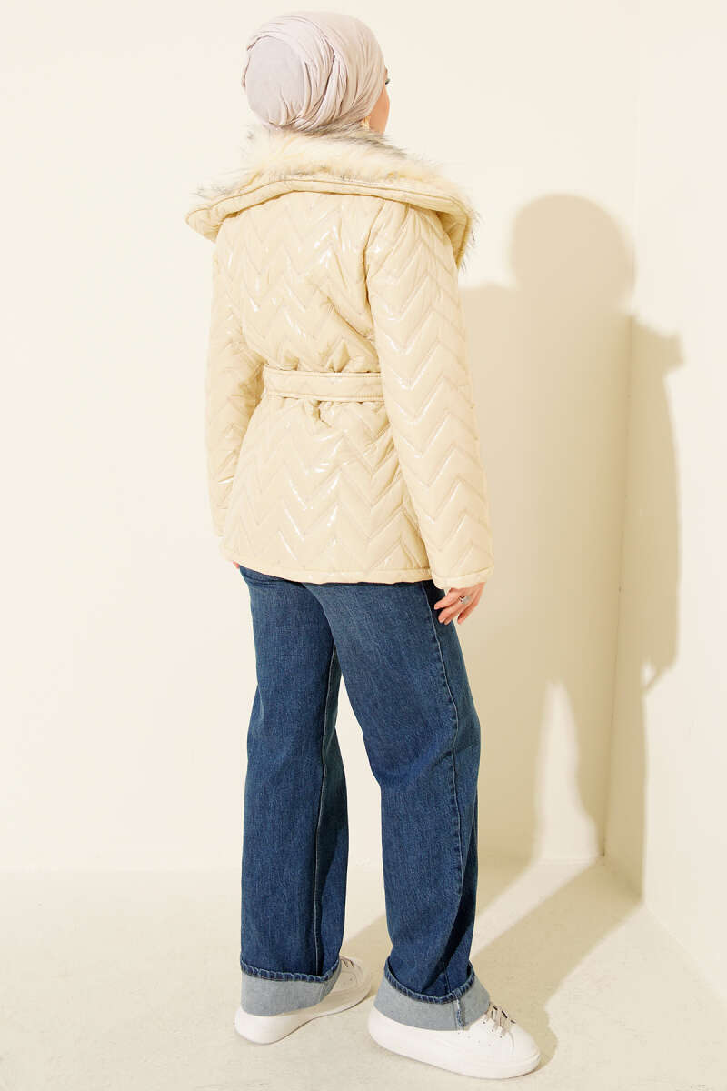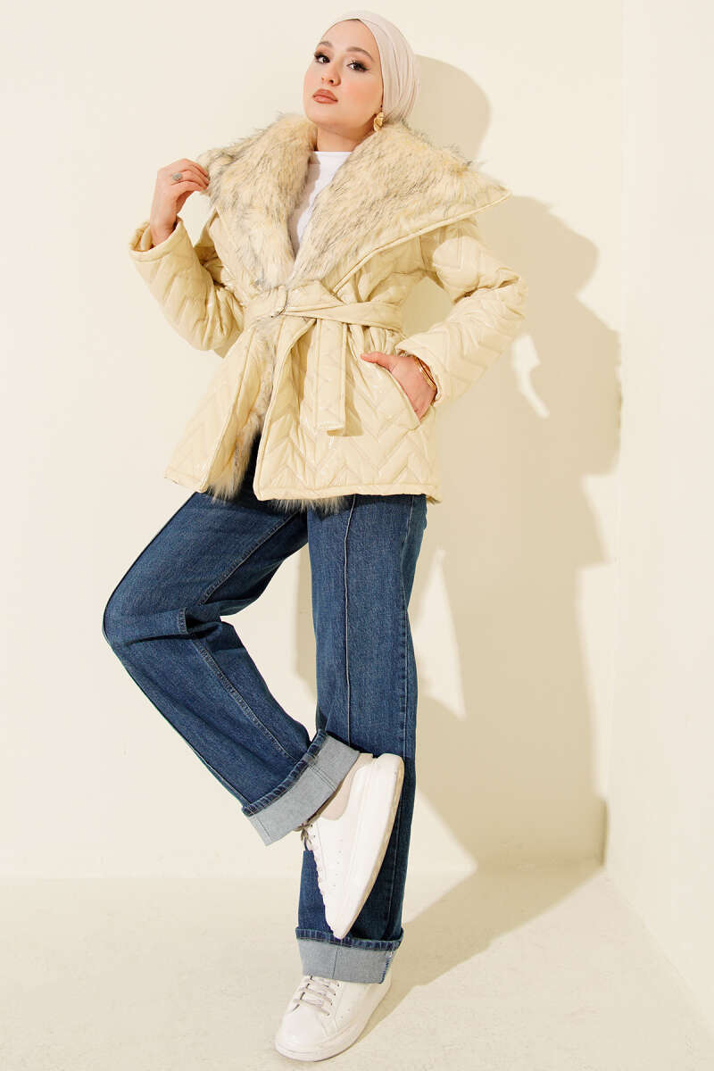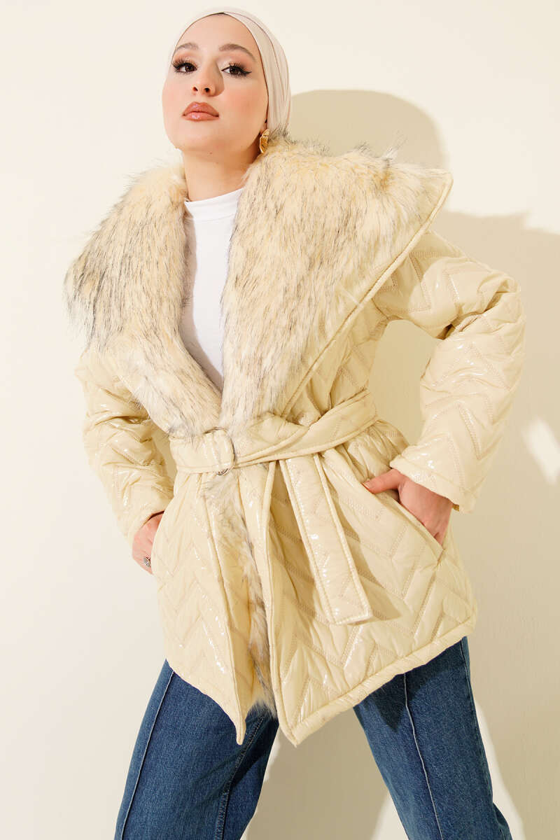 Kuşaklı Peluş Detaylı Kapitone Mont Bej