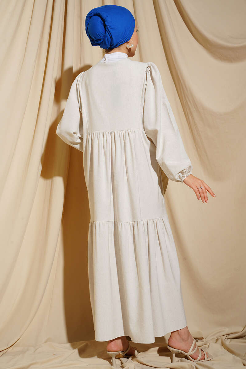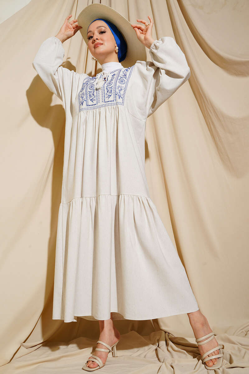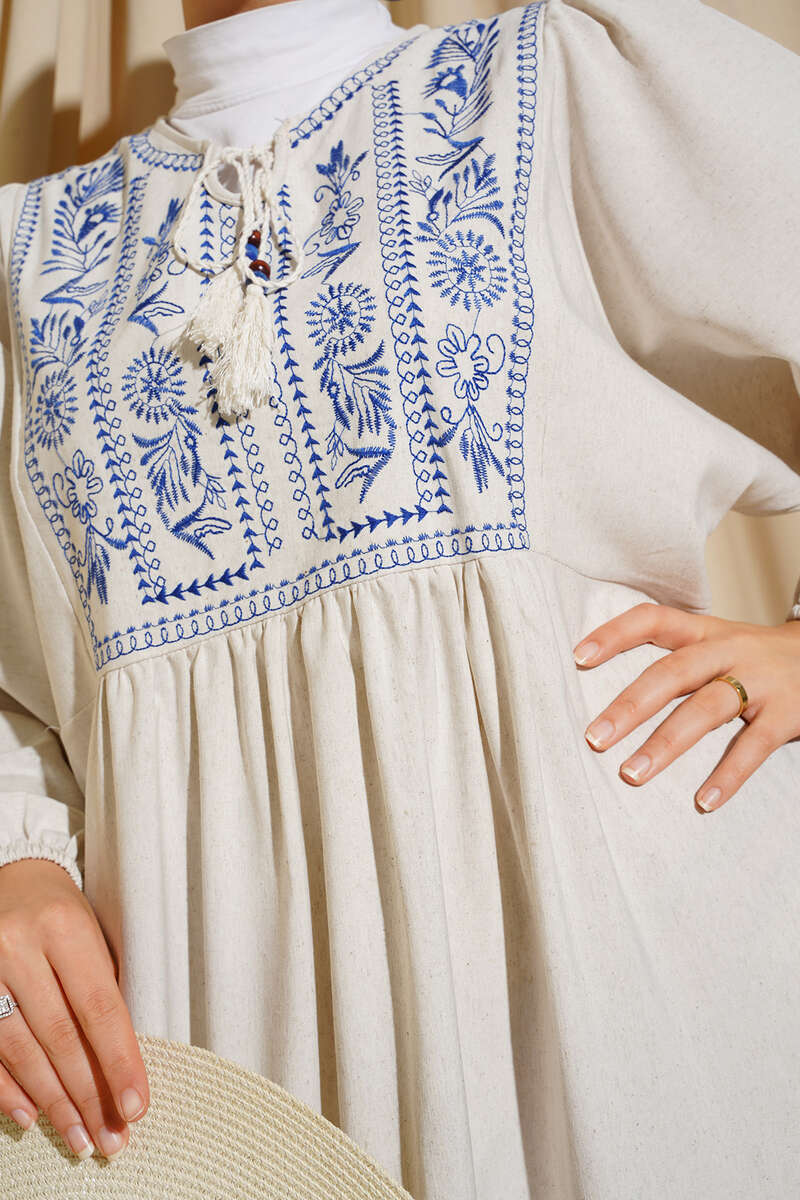 Yeni sezon keten elbisemiz yazın vageçilmezi olacaktır. Yakası nakış işlemeli olan elbisemizin yakası aynı zamanda ip baplamalıdır. Yarasa kol olan elbisemizin bilekleri lastiklidir.