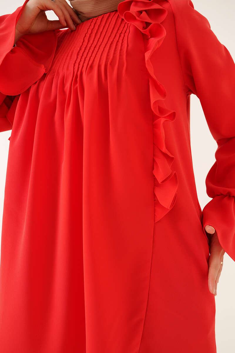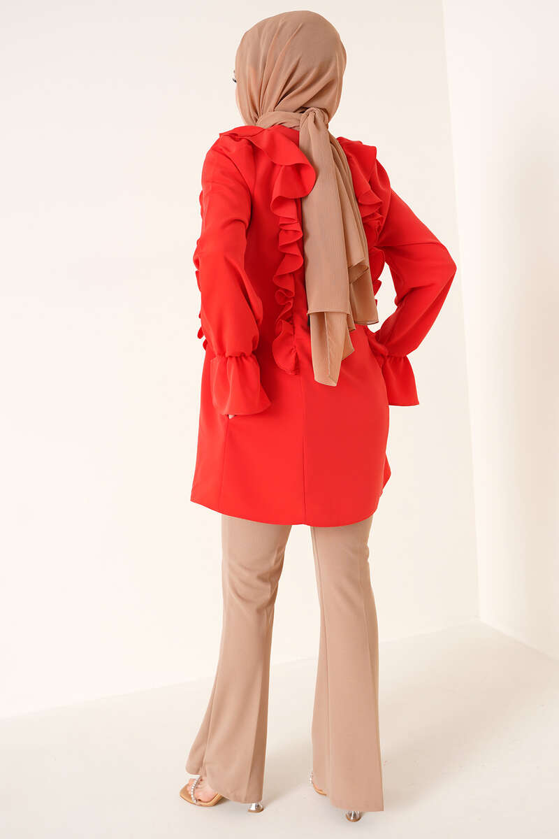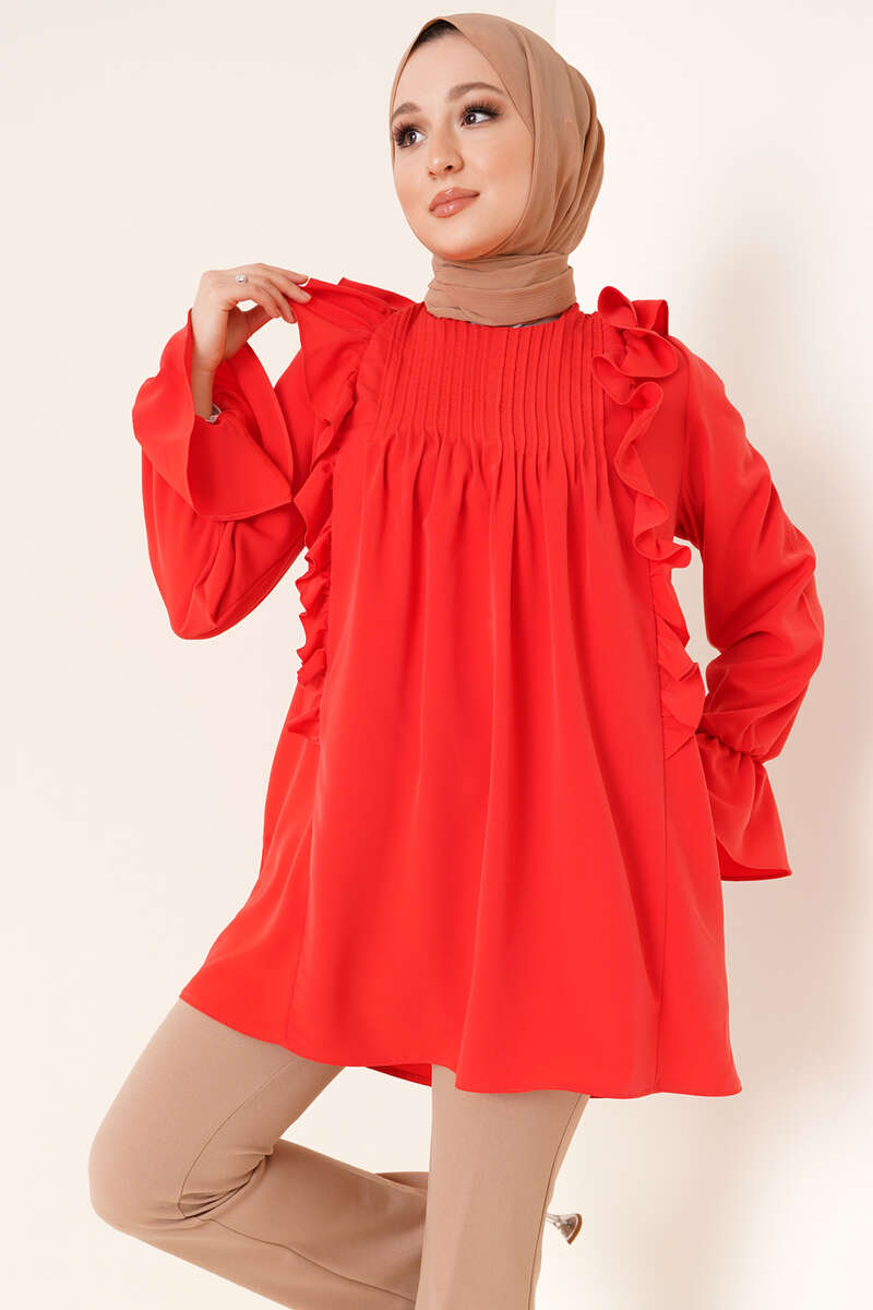 Yeni sezon tunik fırfır detaylıdır. Yakası nervürlü olan tuniğimiz bileğindeki lastik detayıyla hareket kazanmıştır. Ense düğmesi bulunan tuniğimizin yanlarında iki adet cebi bulunmaktadır.