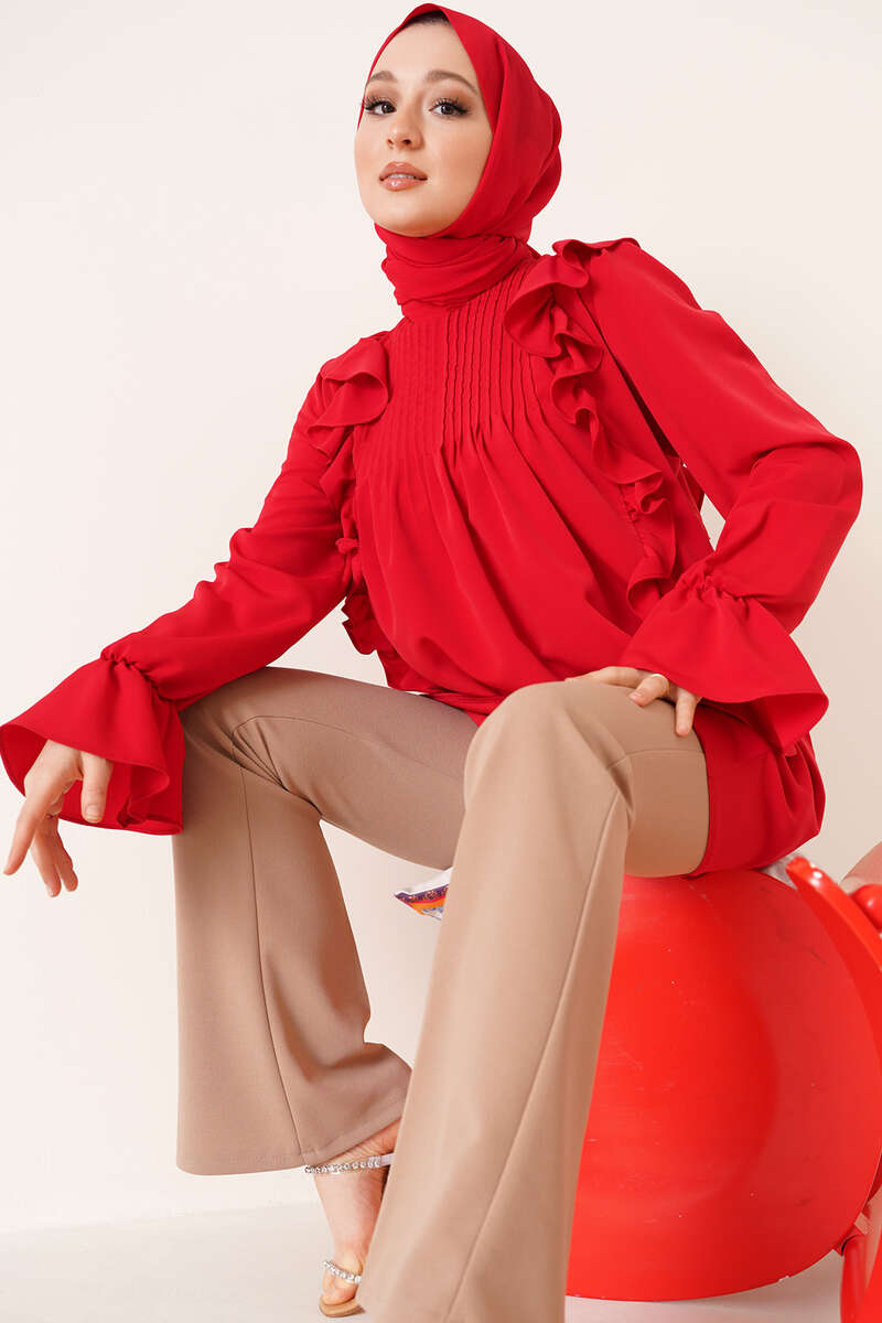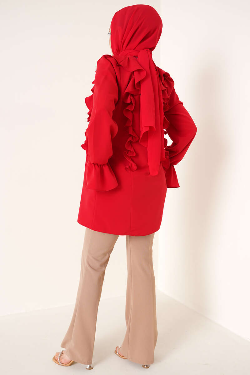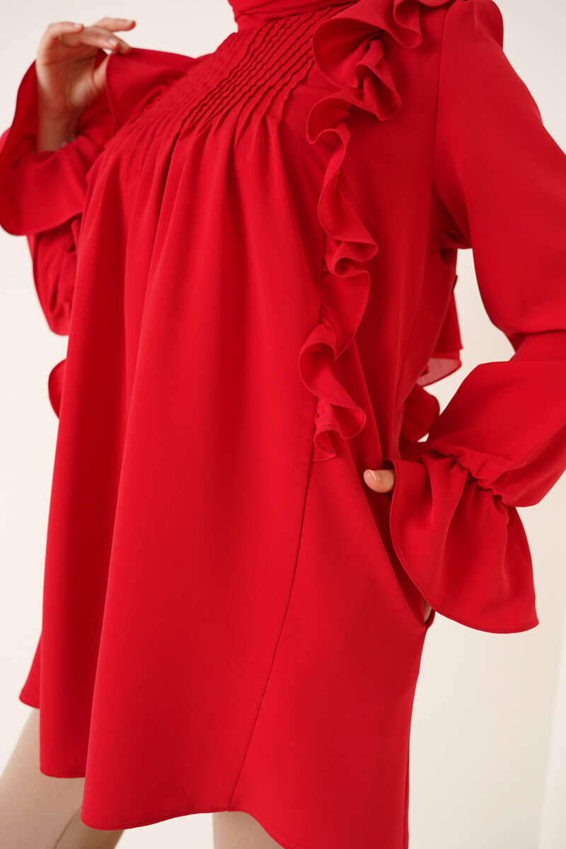 Yeni sezon tunik fırfır detaylıdır. Yakası nervürlü olan tuniğimiz bileğindeki lastik detayıyla hareket kazanmıştır. Ense düğmesi bulunan tuniğimizin yanlarında iki adet cebi bulunmaktadır.