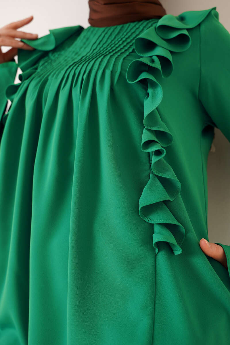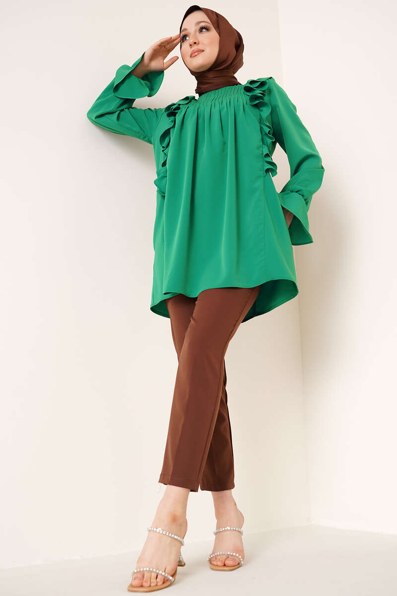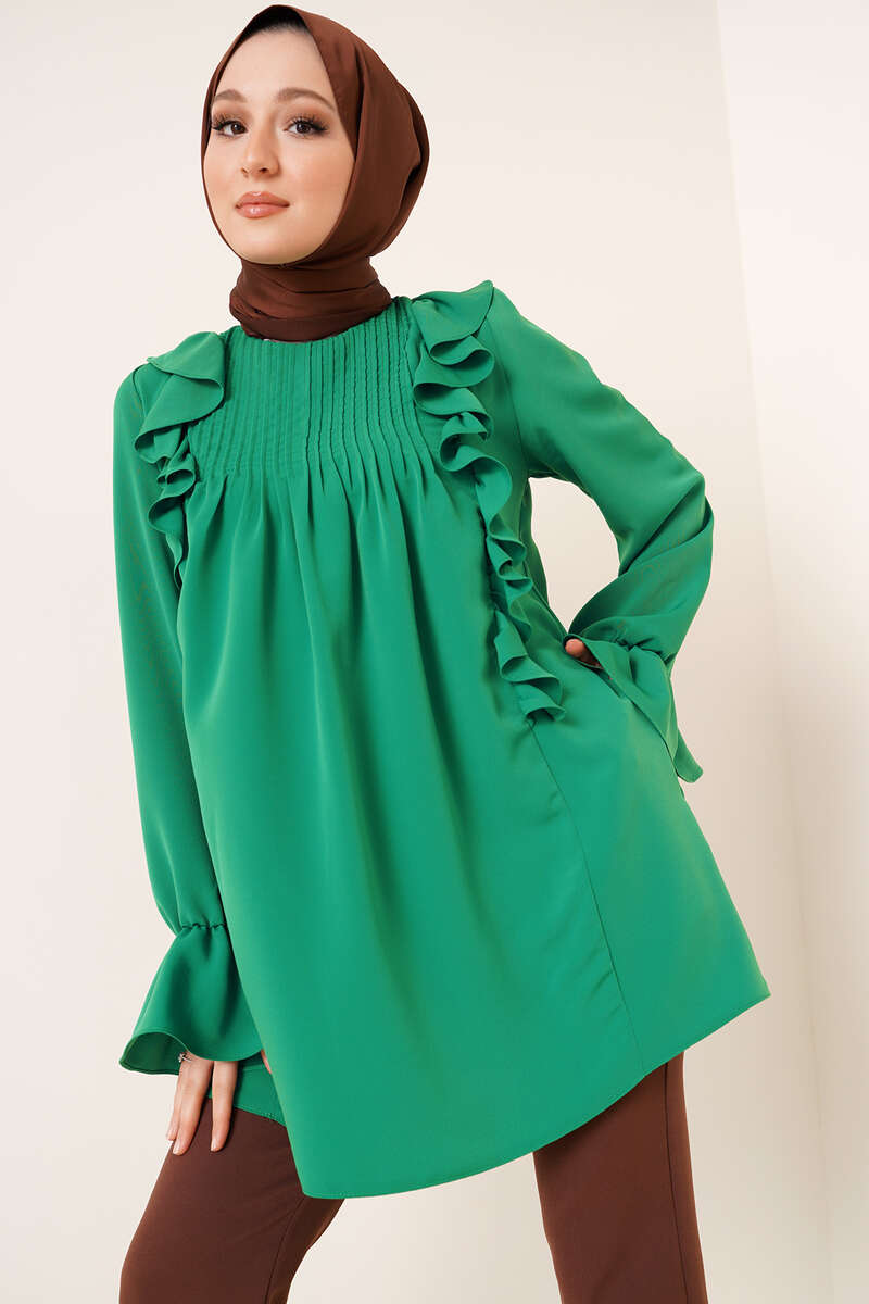 Yeni sezon tunik fırfır detaylıdır. Yakası nervürlü olan tuniğimiz bileğindeki lastik detayıyla hareket kazanmıştır. Ensu düğmesi bulunan tuniğimizin yanlarında iki adet cebi bulunmaktadır.