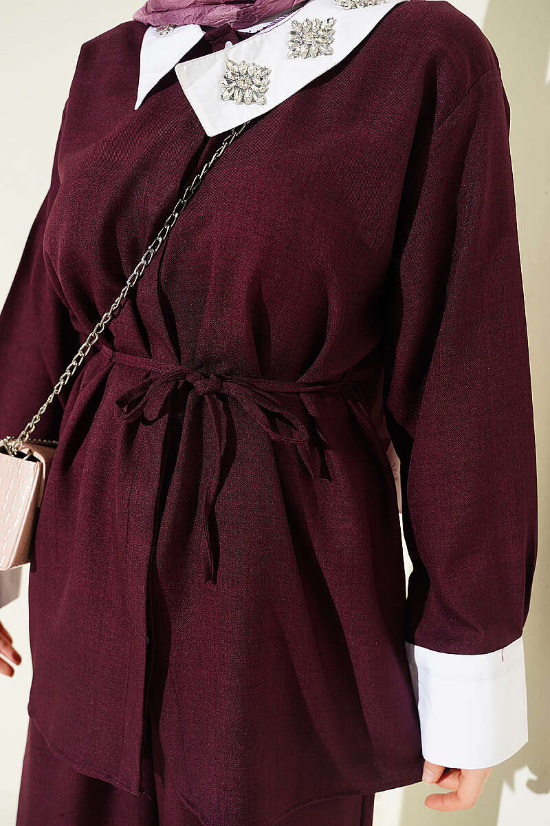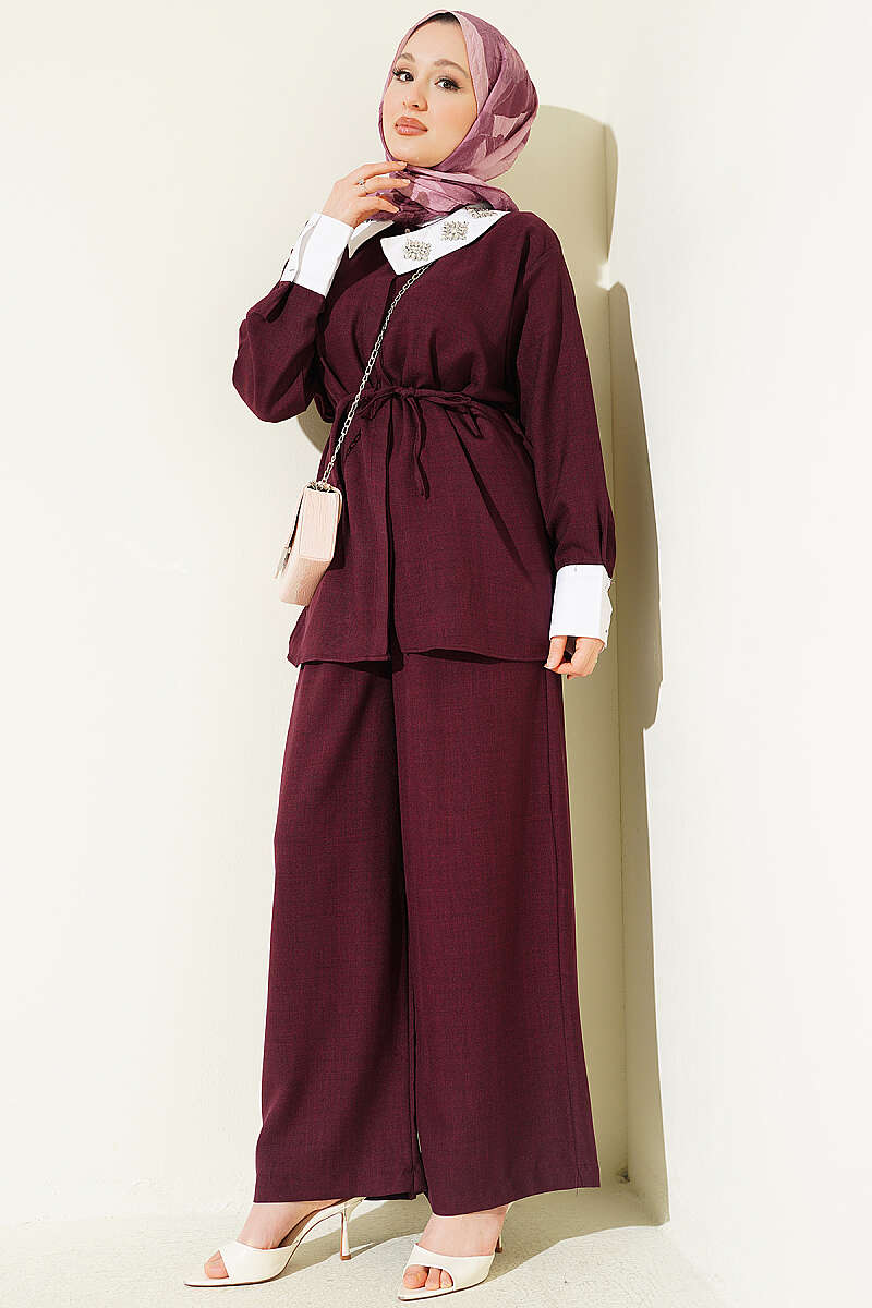 Yakası Taşlı Gizli Düğmeli İkili Takım Bordo