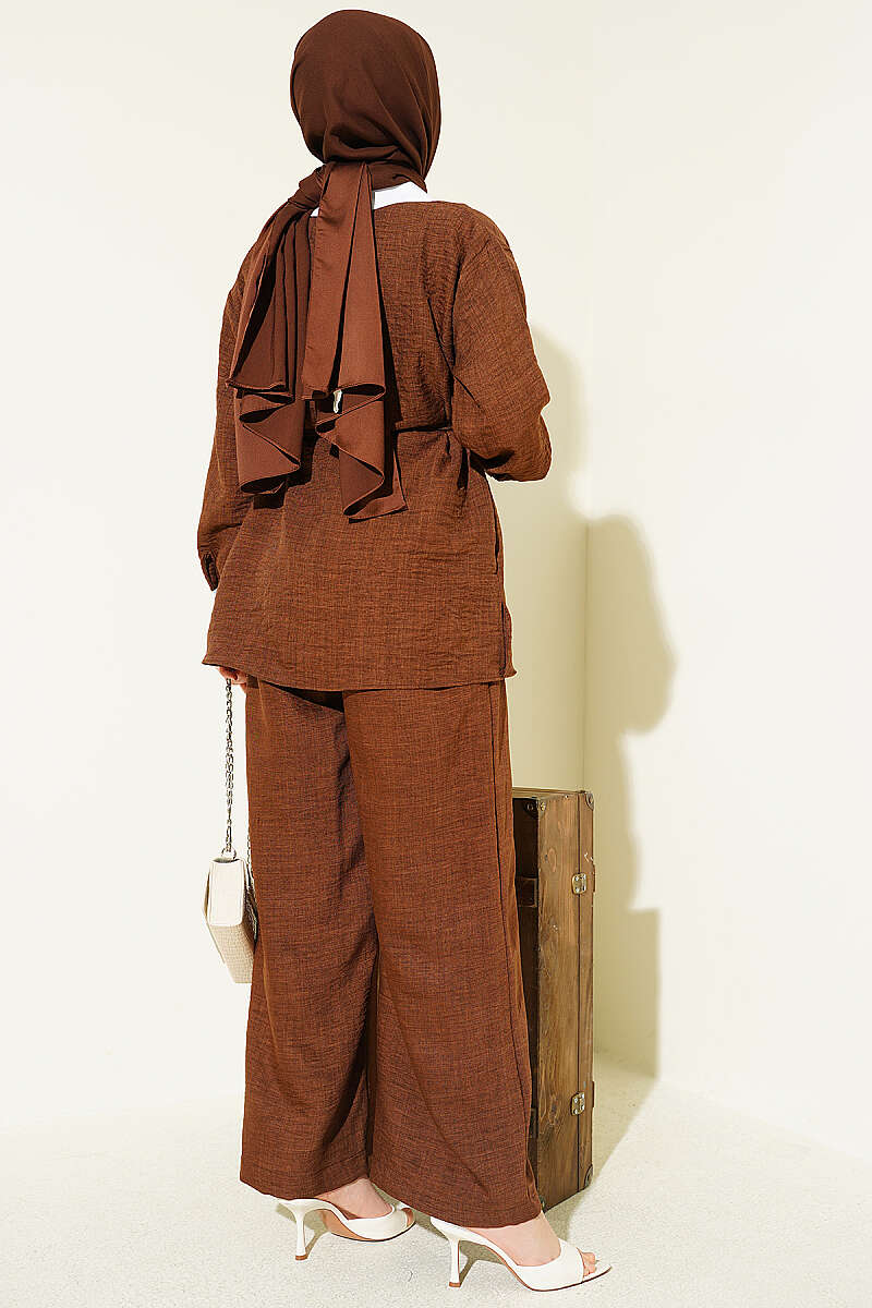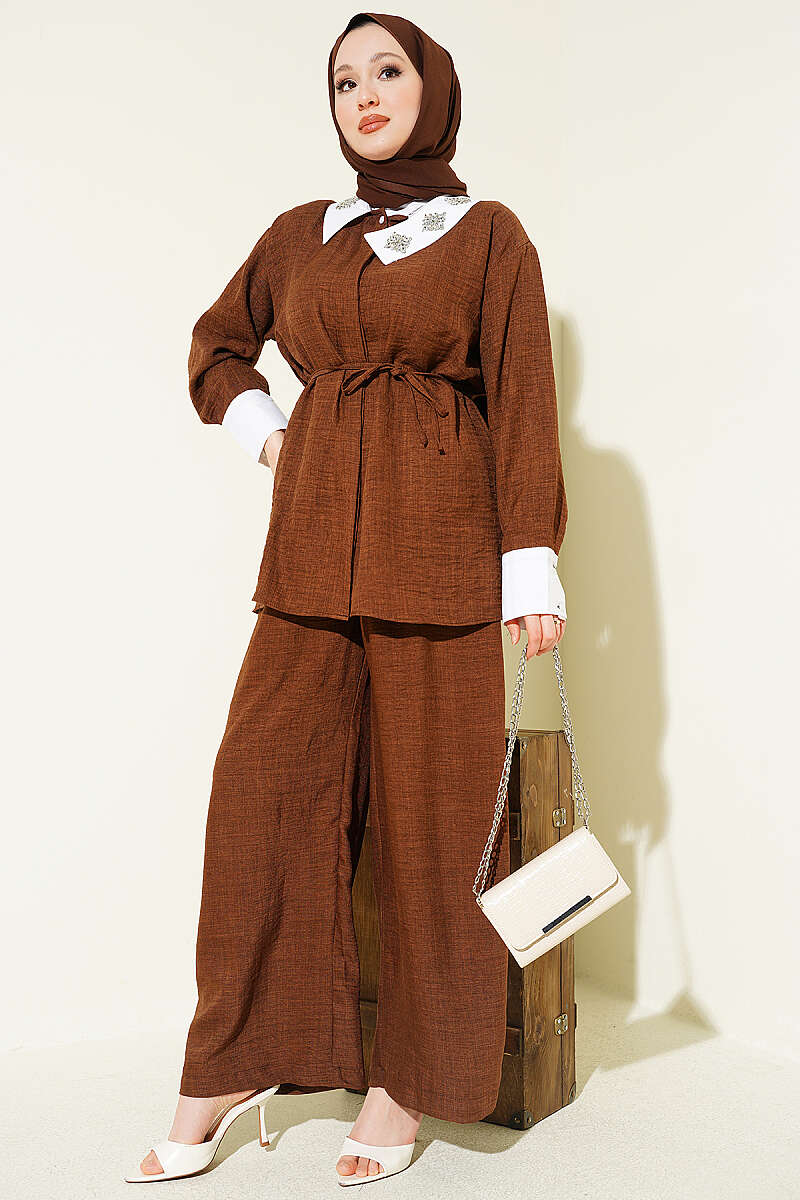 Yakası Taşlı Gizli Düğmeli İkili Takım Kahve