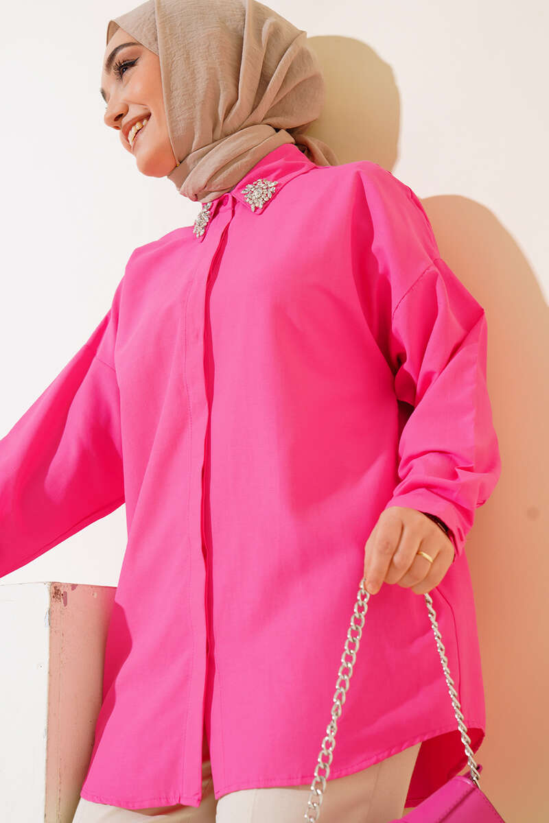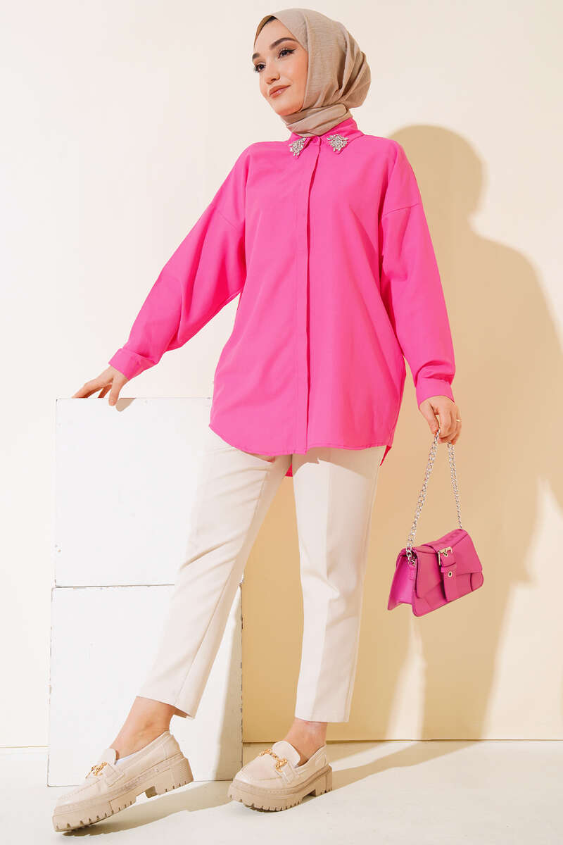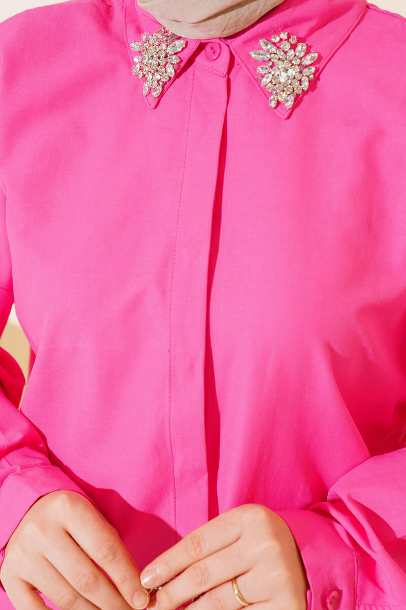 Yeni sezon model gömleğimiz şık tasarımıyla sizlerle birlikte. Yakası taş süslemelidir. Önü düğmelidir. Kolları katlanabilir. Her kıyafetinizle rahatlıkla kombinleyebilirsiniz.