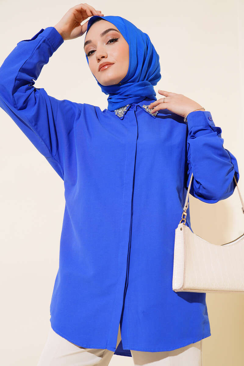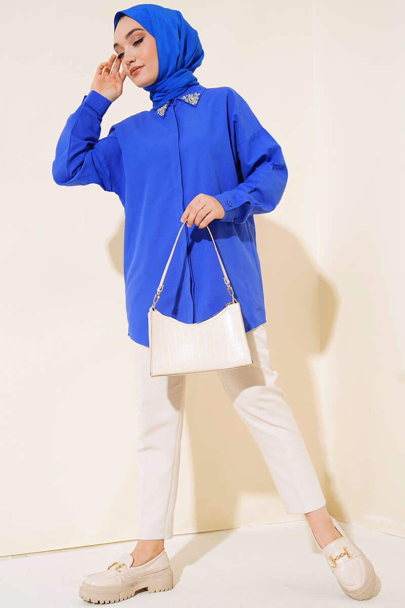 Yeni sezon model gömleğimiz şık tasarımıyla sizlerle birlikte. Yakası taş süslemelidir. Önü düğmelidir. Kolları katlanabilir. Her kıyafetinizle rahatlıkla kombinleyebilirsiniz.