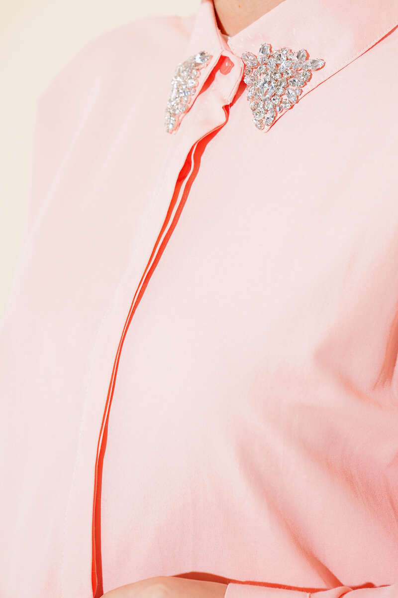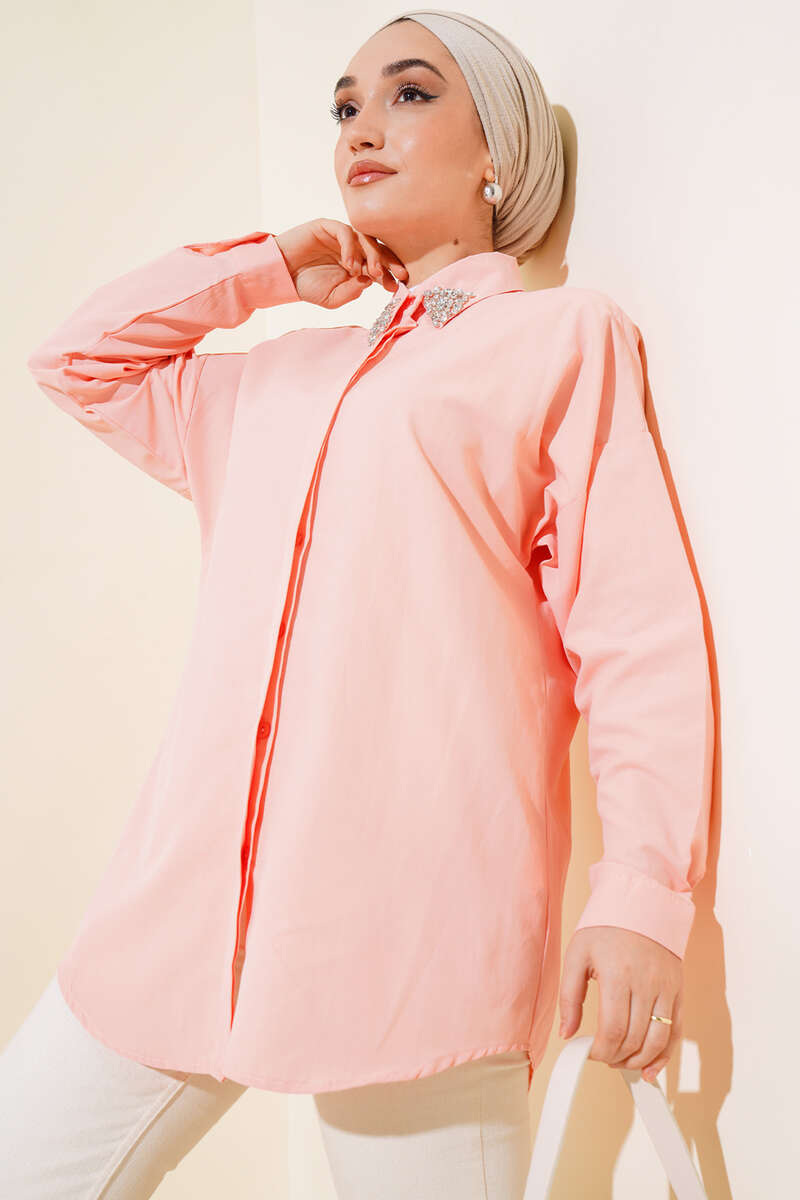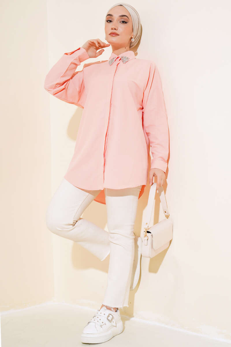 Yeni sezon model gömleğimiz şık tasarımıyla sizlerle birlikte. Yakası taş süslemelidir. Önü düğmelidir. Kolları katlanabilir. Her kıyafetinizle rahatlıkla kombinleyebilirsiniz.