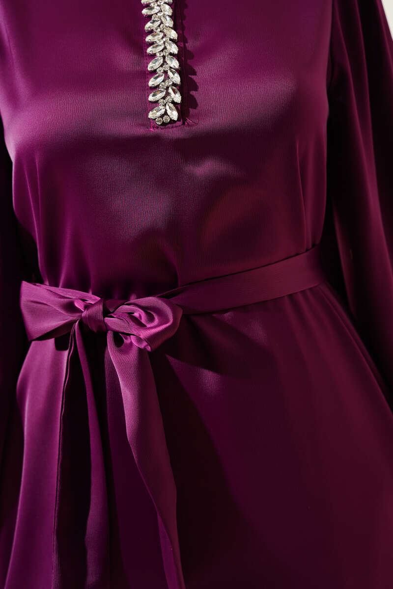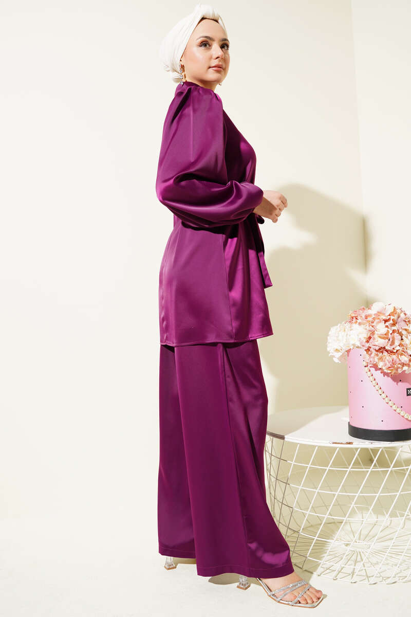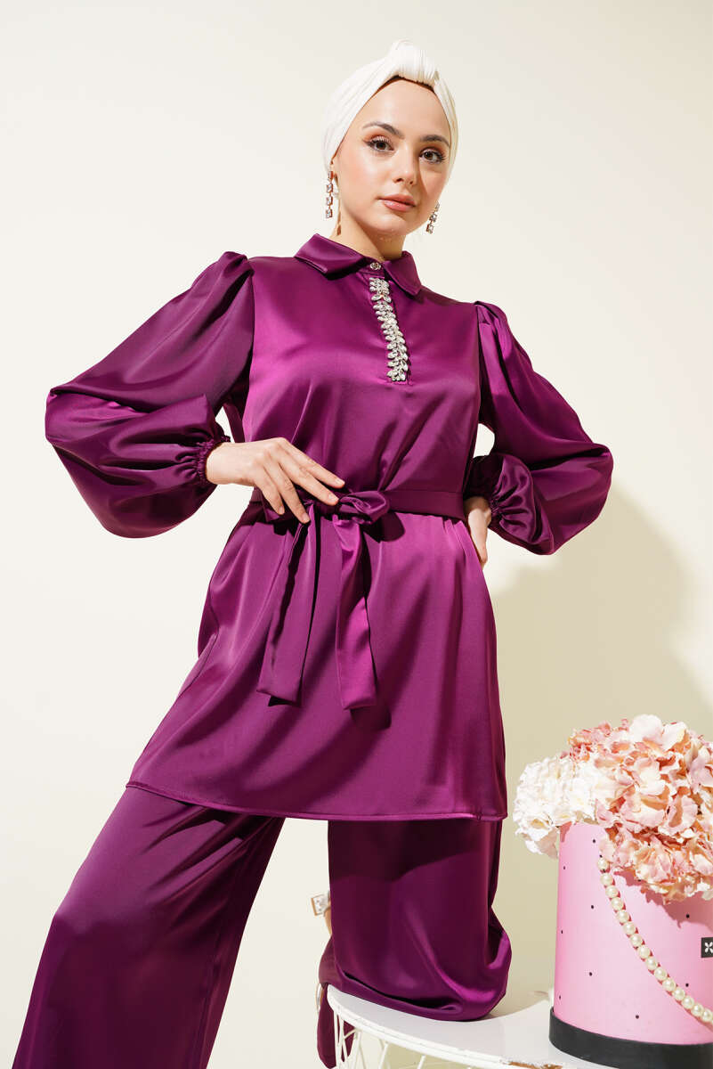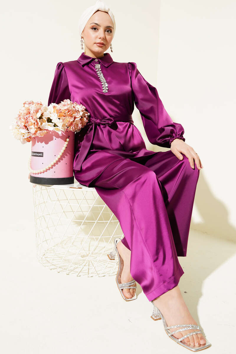 Yakası Taşlı Kuşaklı Saten İkili Takım Mürdüm